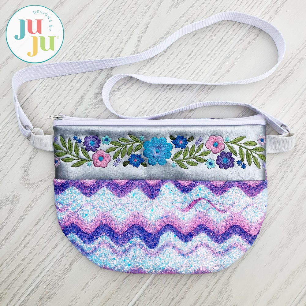 Made in one hooping; fully lined with no exposed seams! Only one small opening has to be closed in the lining after embroidery is complete. The design file includes steps for adding optional tabs on the left and right so you can add a wrist strap or shoulder strap.