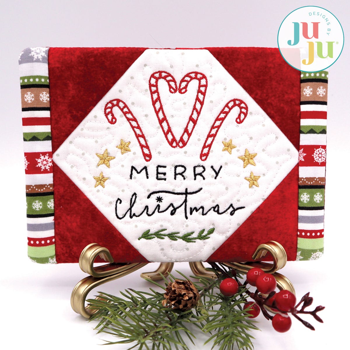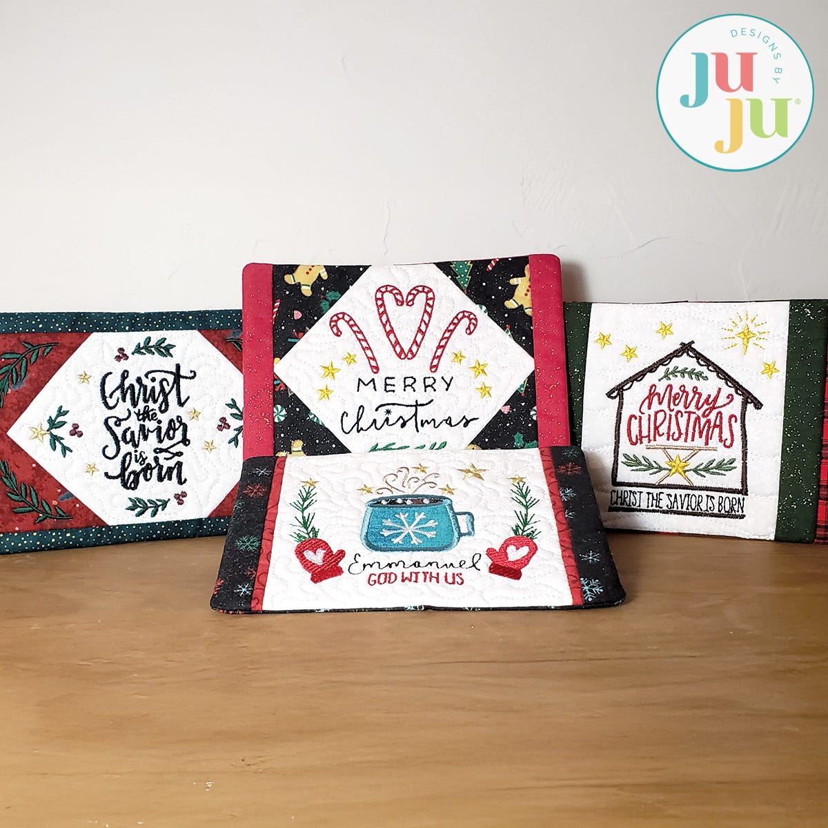 This Inspirational Christmas - Candy Cane Mug Rug is entirely stitched in the hoop. No additional hand or sewing machine stitching required. The center background is stipple quilted and the pieced corners as well as borders are applied as part of your embroidery. Thorough and detailed instructions as well as many photos will guide you through the process of making these mug rugs.