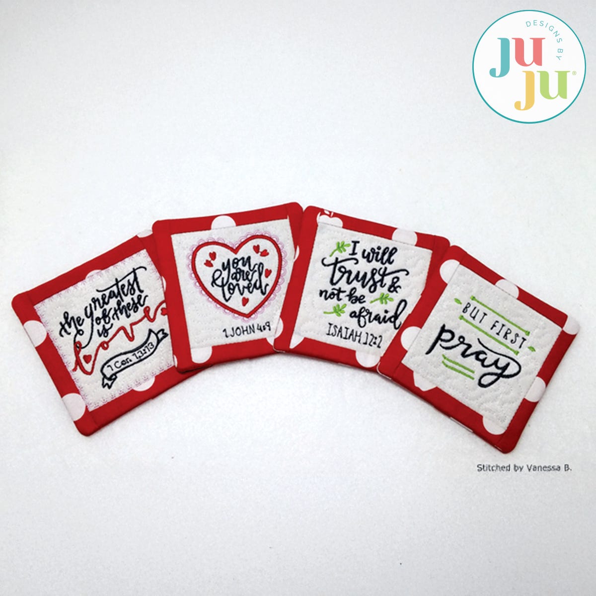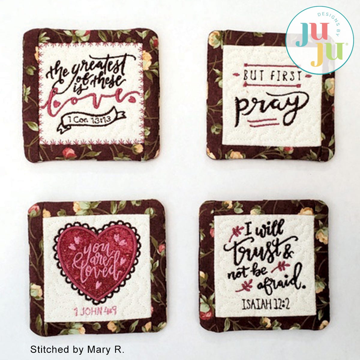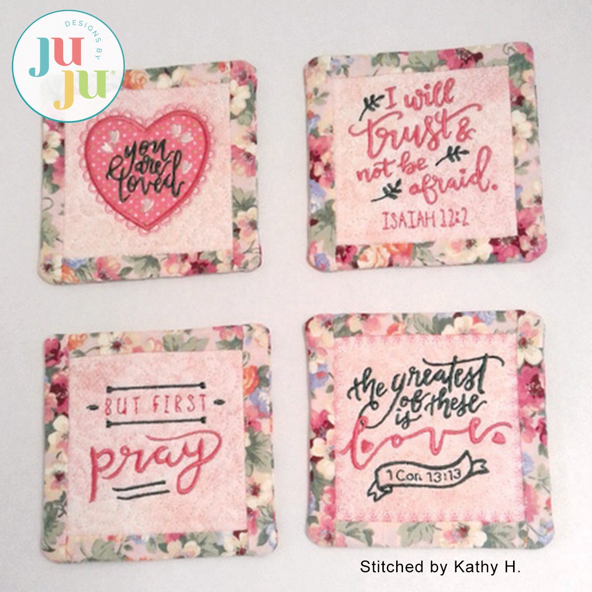 This set of 4 inspirational coasters is entirely completed in a 4x4" hoop on the embroidery machine. No additional hand or sewing machine stitching required. Each coaster has a different inspirational message. One of the coasters has an applique heart on it. If you have never done applique before, you will love how easy it is to do. We give thorough instructions with photos in pdf format. The center of the coasters is stipple quilted and the border strips are applied while in the hoop.
