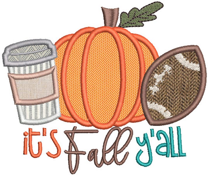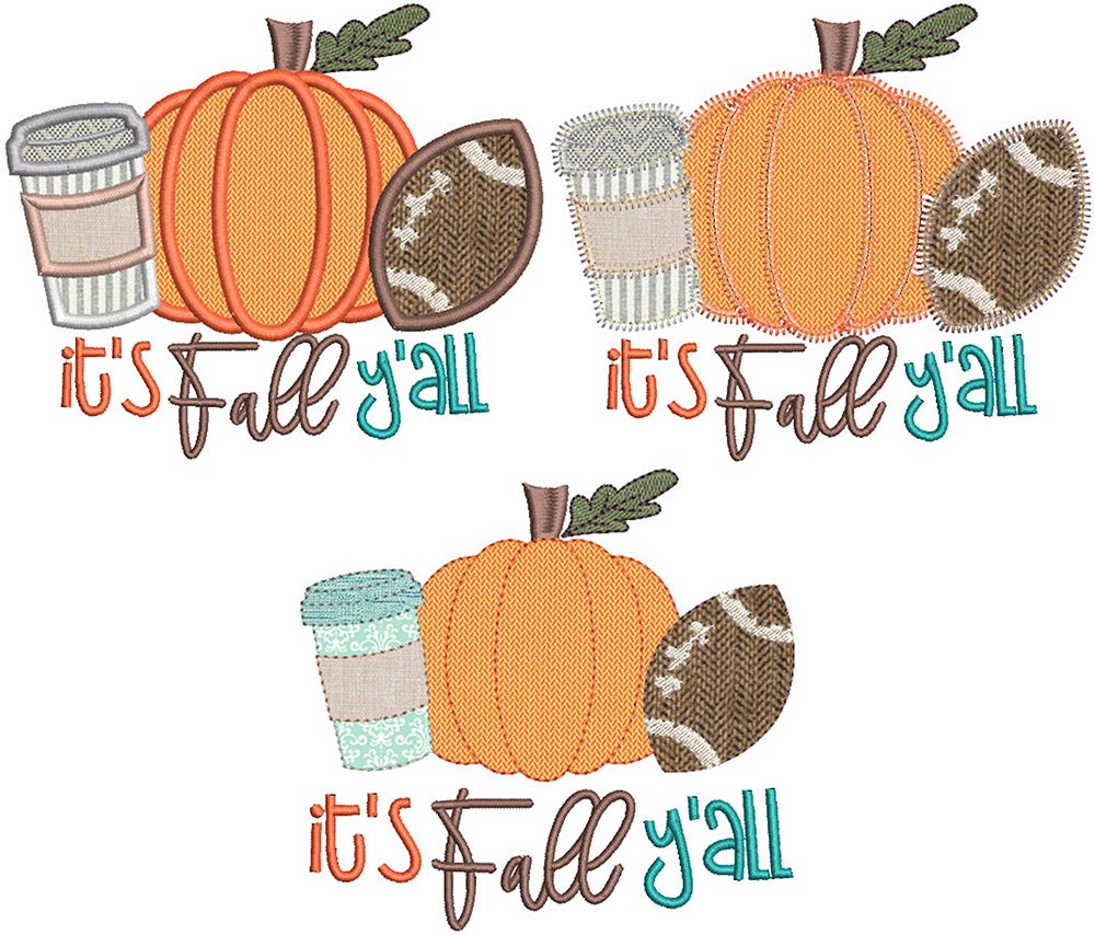 This fall trio of a coffee cup, pumpkin and football comes in three applique styles: traditional satin stitch, zig zag stitch,