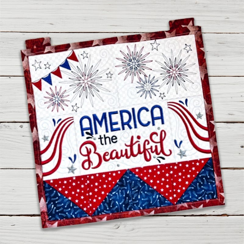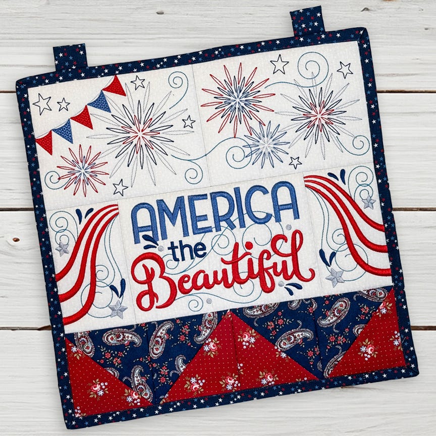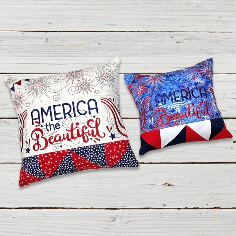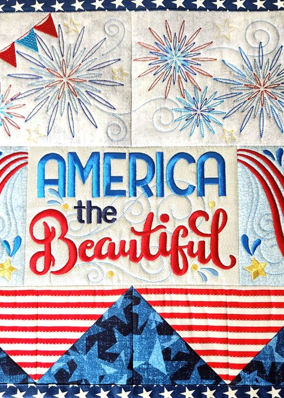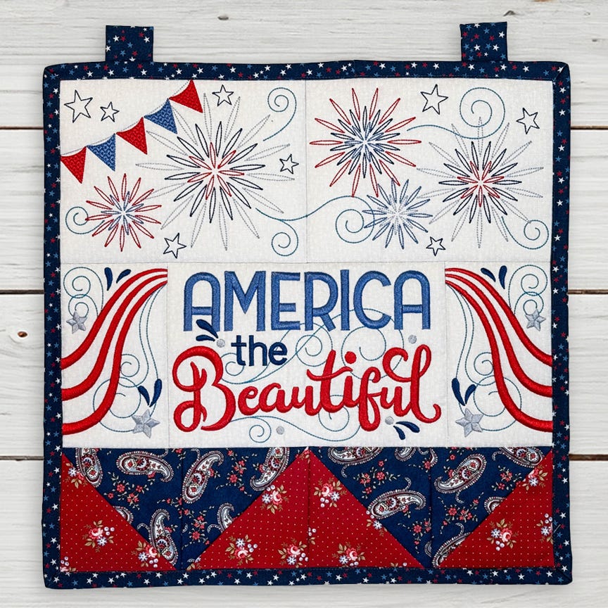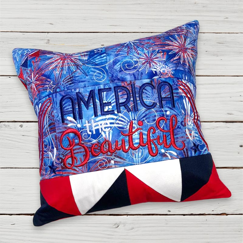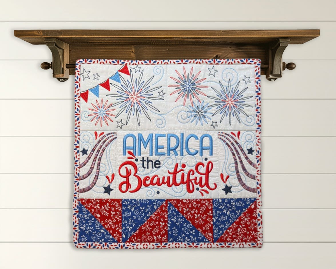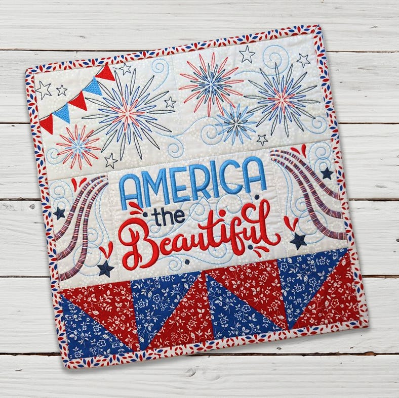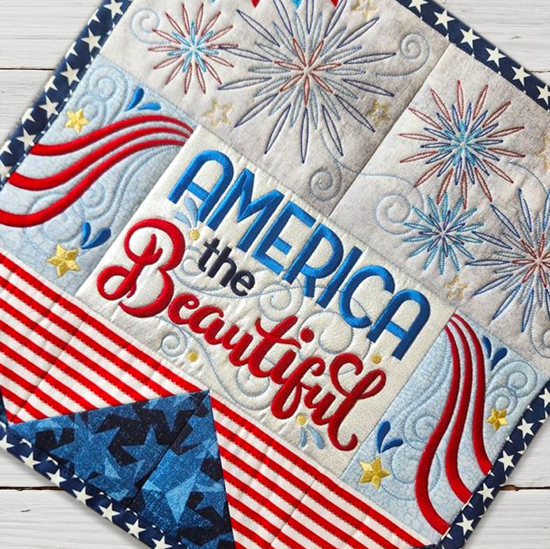 Make a patriotic petite quilt to honor America the Beautiful! This project features bean stitch fireworks above satin stitch lettering, stars and stripes. It's the perfect size for a little table decoration. Add tabs for a wall hanging, or make it a pillow!