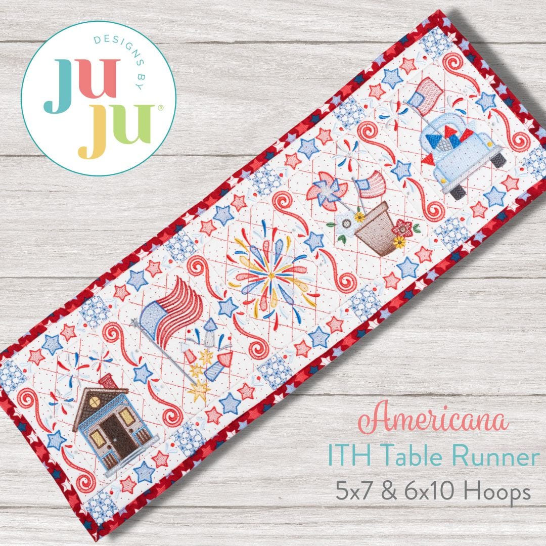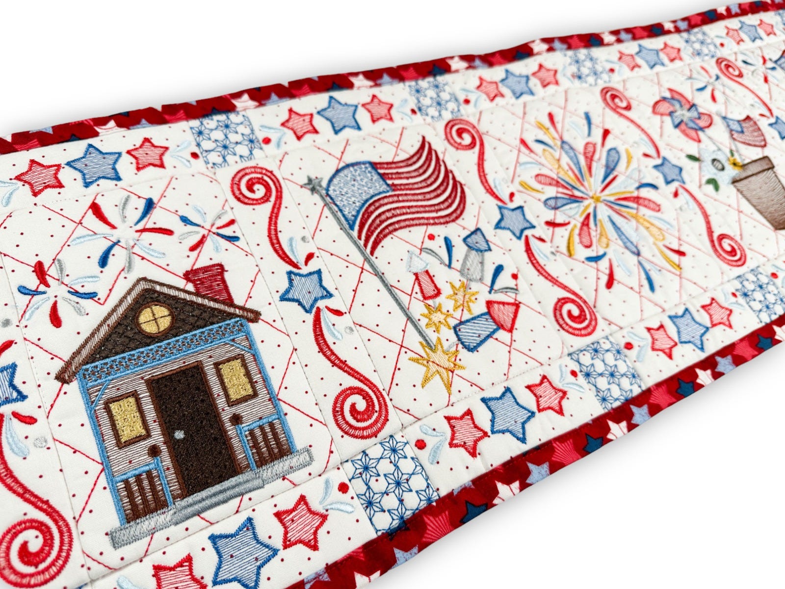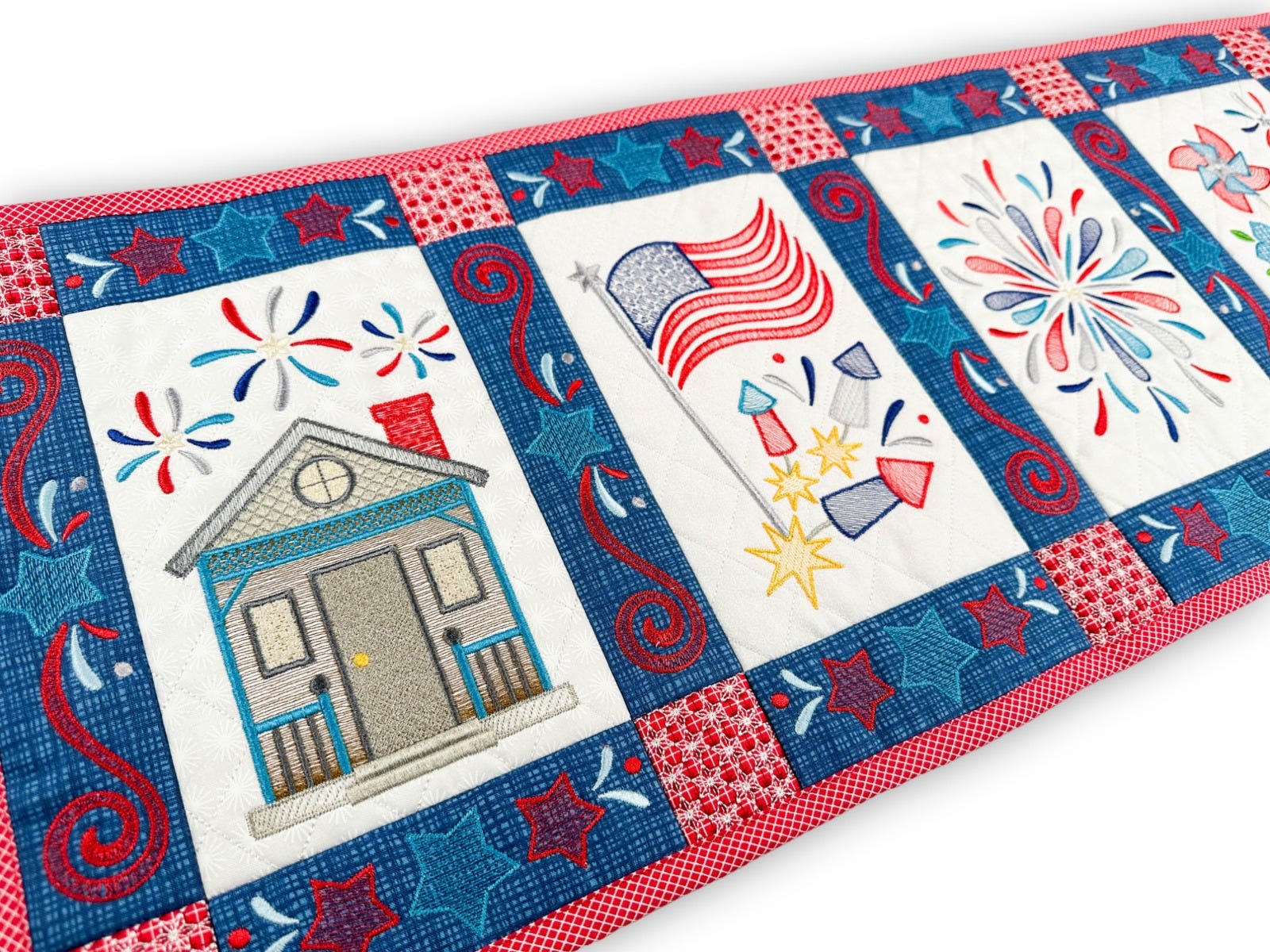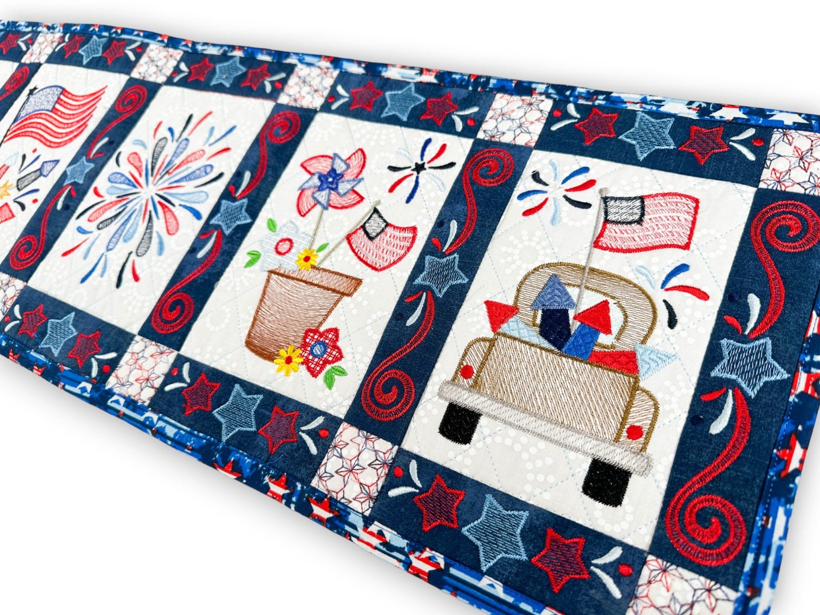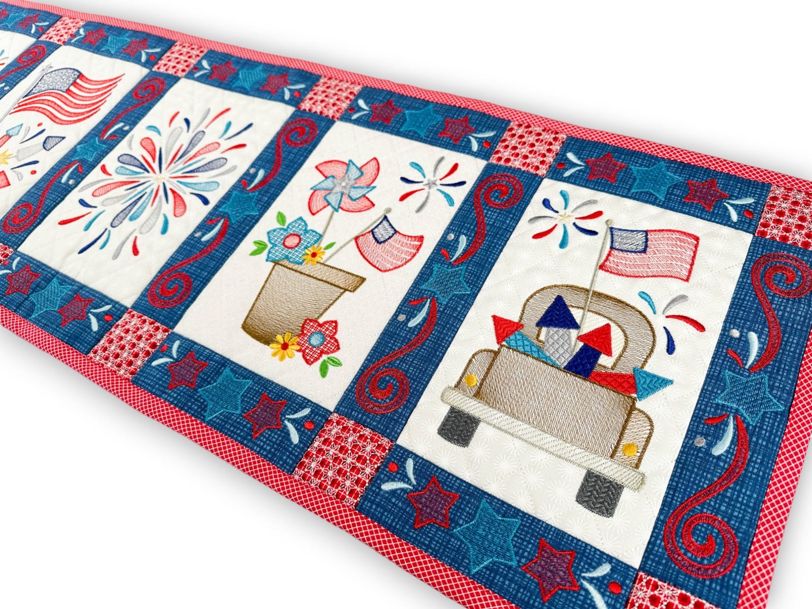 Create a patriotic table setting with our Americana Table Runner! This table runner features sketch fill and motif fill patterns, allowing for a quicker stitch out than solid fill patterns. Therefore we recommend simple, tone-on-tone prints for the background fabrics and coordinating thread for the quilting, as they may show through the designs.