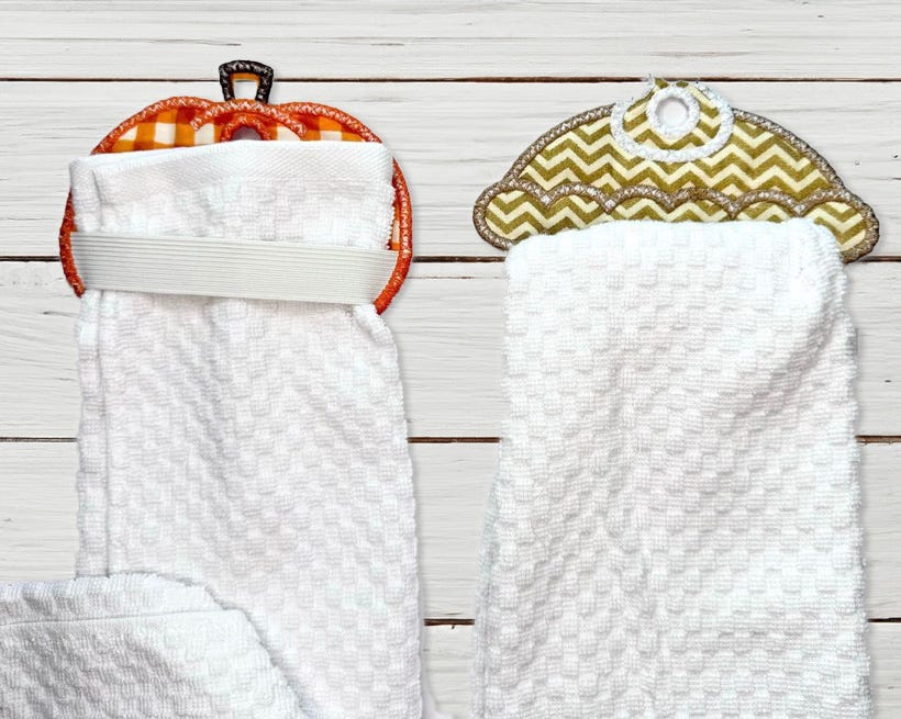 Decorate your kitchen for fall with these In-the-Hoop Towel Toppers! This set includes 2 towel hanger designs: