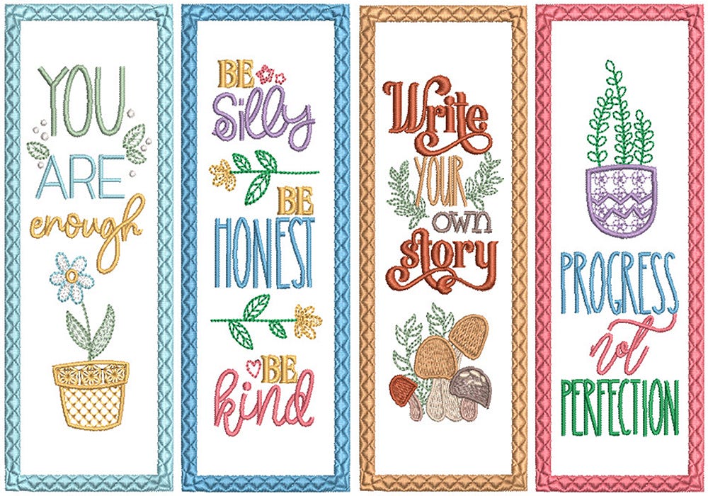 Find encouragement each time you open your book with one of our bookmarks! Coordinate the fabric on the back of each bookmark with the colors of the detailed embroidery to create unique and memorable bookmarks! The embroidered details feature bean stitch, satin stitch, motif, sketch and fill elements. Available in 3 sizes in each of the four designs.