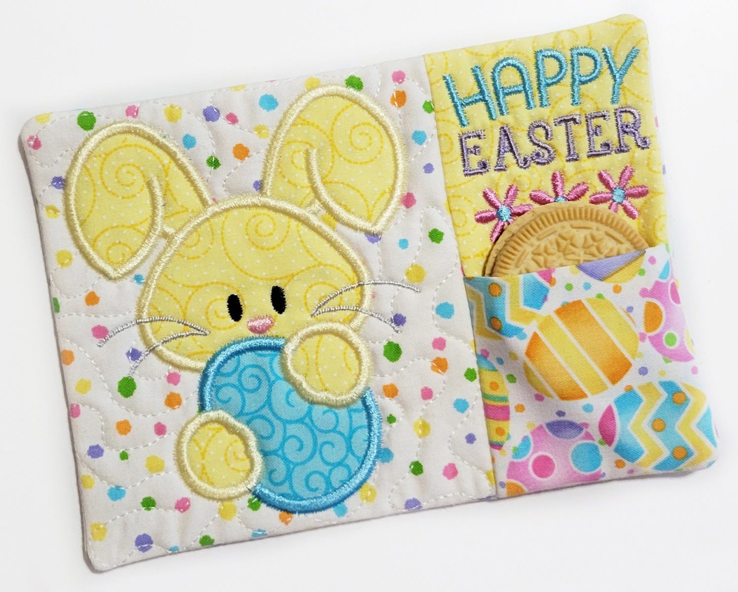 Cute Bunny with an Easter Egg mug rug, which also includes a fun pocket for snacks, silverware, or maybe a special surprise!