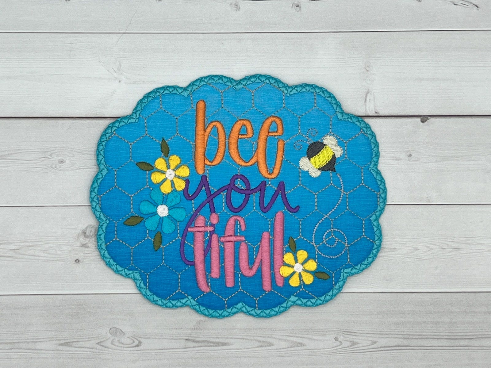 Receive encouragement each time you set down your cup on our Busy Bees BeeYouTiful Mug Rug! Mug rugs are made completely in the hoop. Detailed, step by step photo instructions are included in your download. This mug rug features satin stitch "bee-you-tiful" text with satin, bean and fill stitch design elements. Only one hooping required, with no additional sewing.