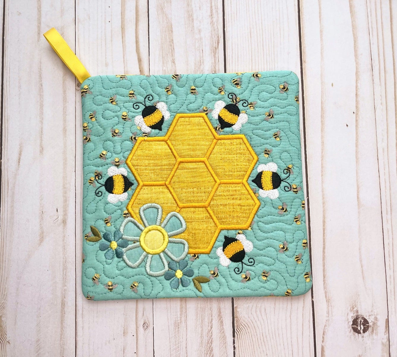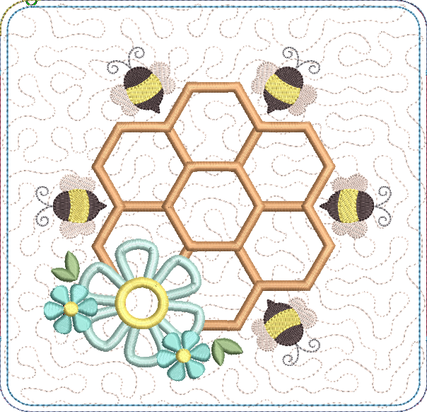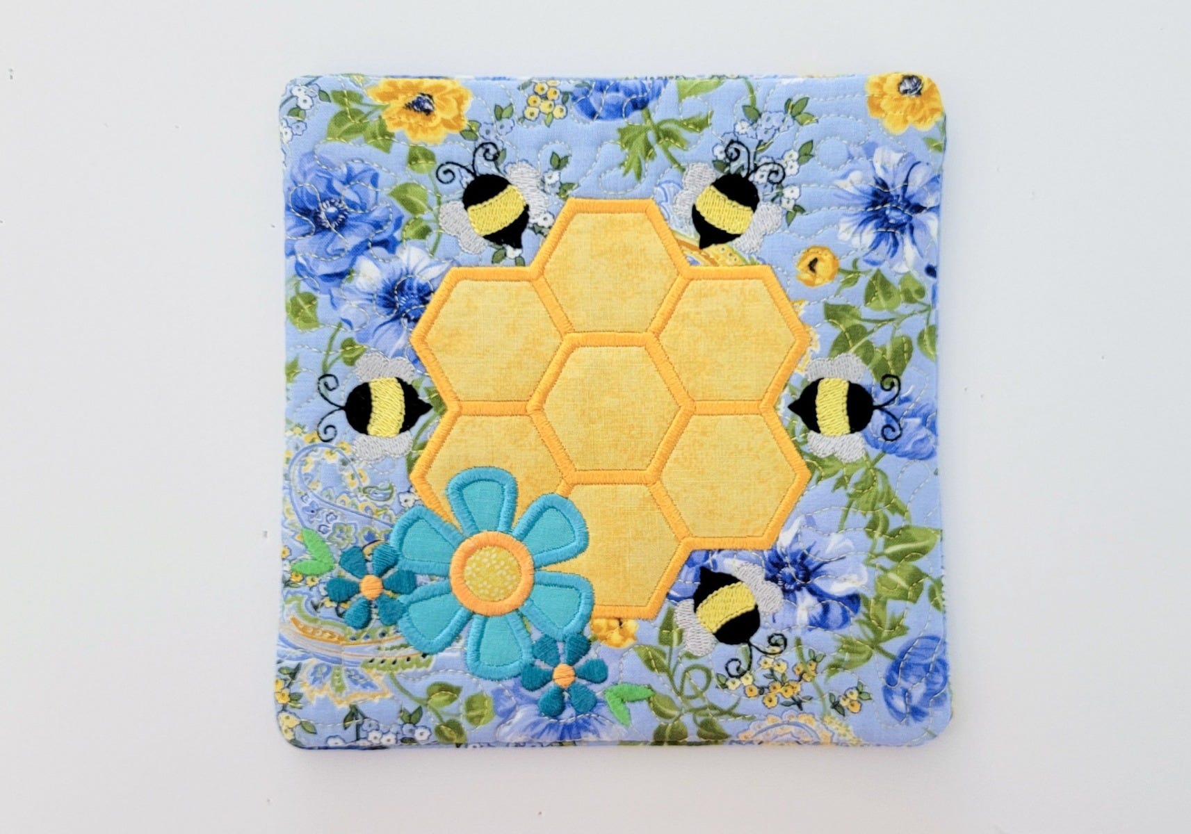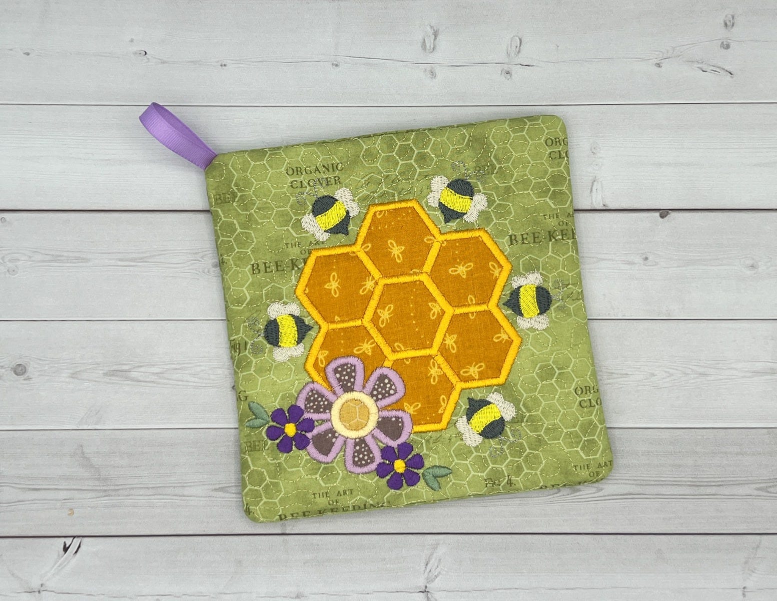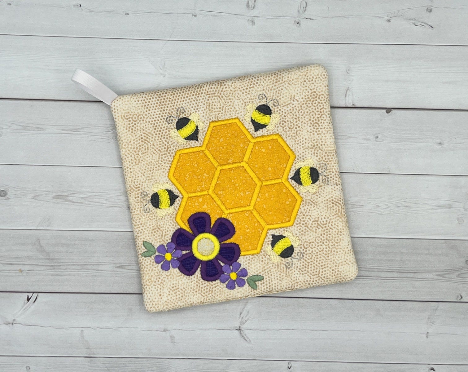 honeycomb and flower along with satin, bean and fill stitch design elements. Customize the pot holder with fun colors