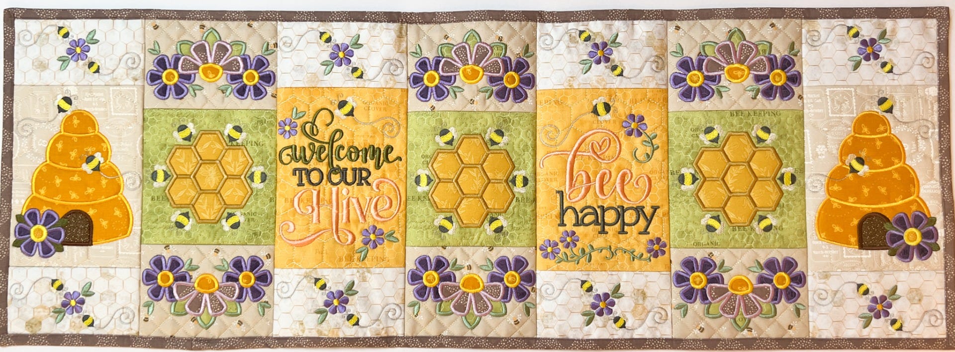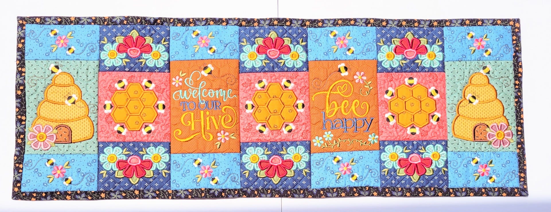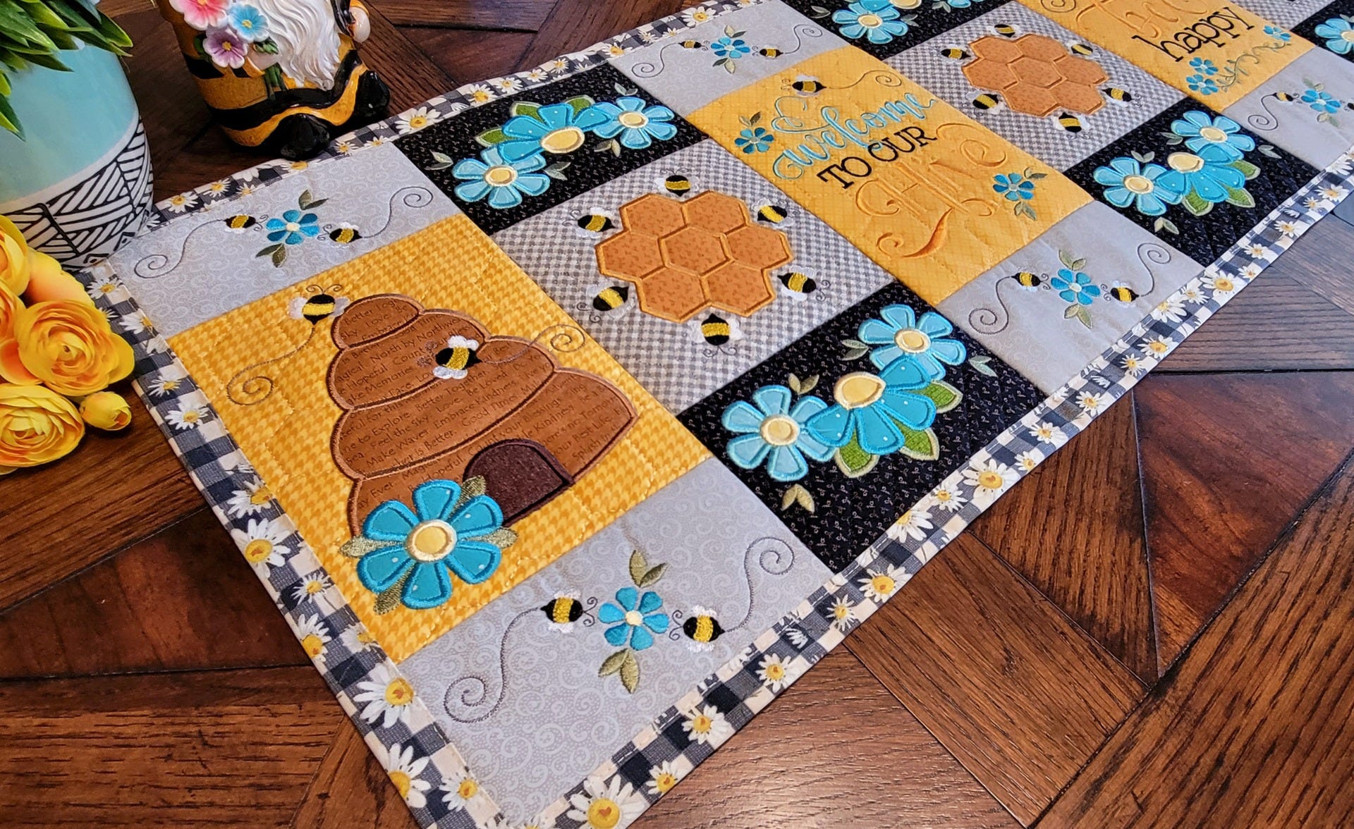 Bright, cheerful, and fun, the Busy Bees Table Runner will be the perfect addition to your table this summer! Coordinate fabric patterns and colors to create a unique table runner that will have everyone buzzing with excitement! This table runner features applique flowers, beehives and honeycomb along with satin stitch text and fill stitch design elements.