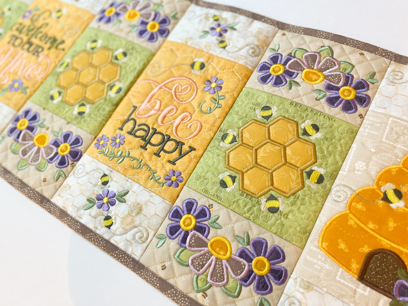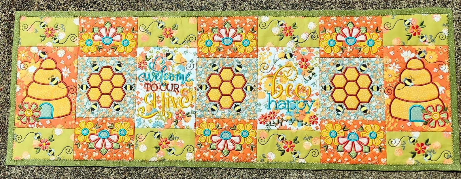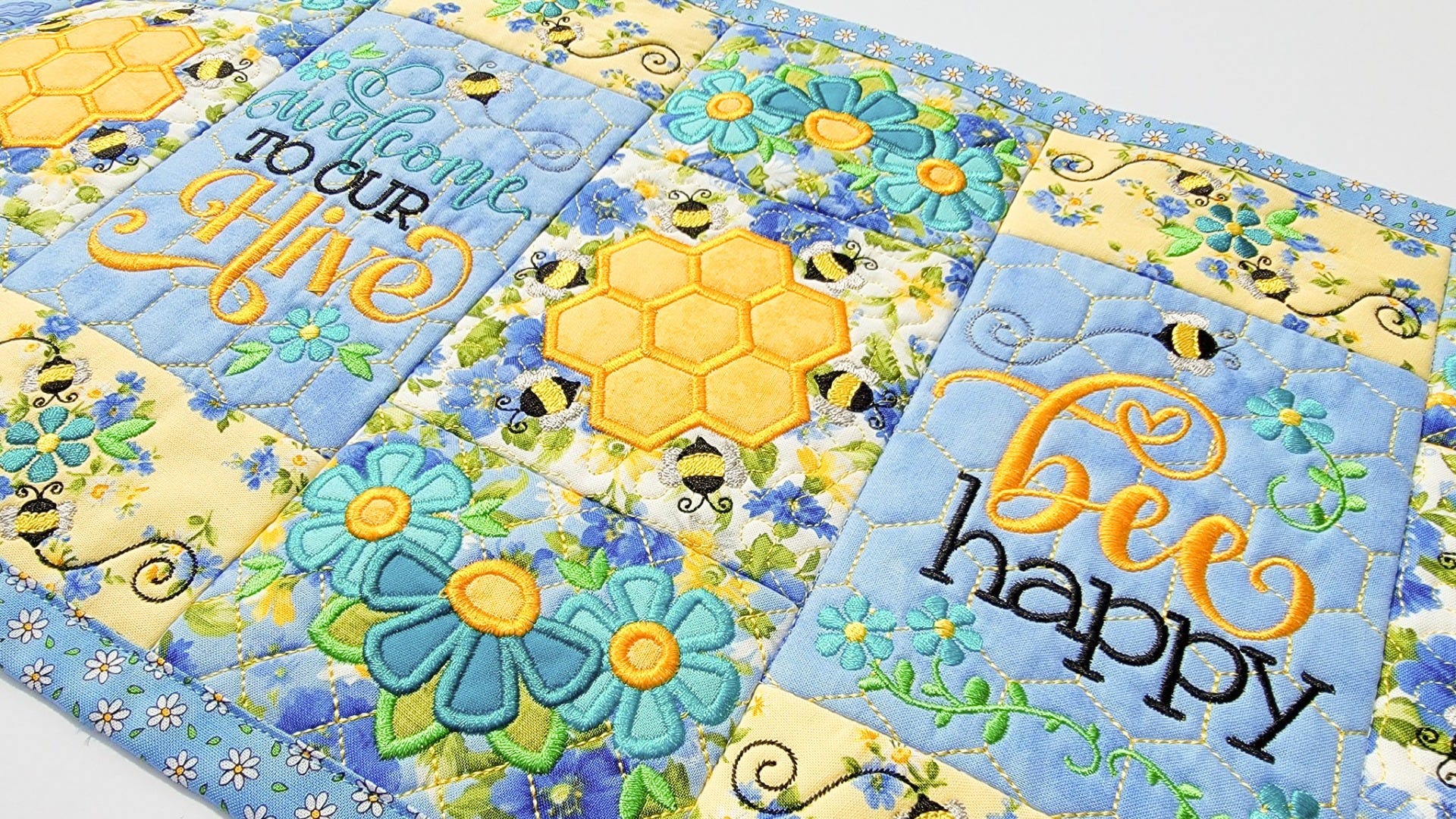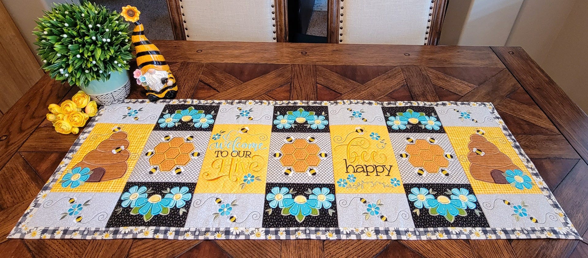 Bright, cheerful, and fun, the Busy Bees Table Runner will be the perfect addition to your table this summer! Coordinate fabric patterns and colors to create a unique table runner that will have everyone buzzing with excitement! This table runner features applique flowers, beehives and honeycomb along with satin stitch text and fill stitch design elements.