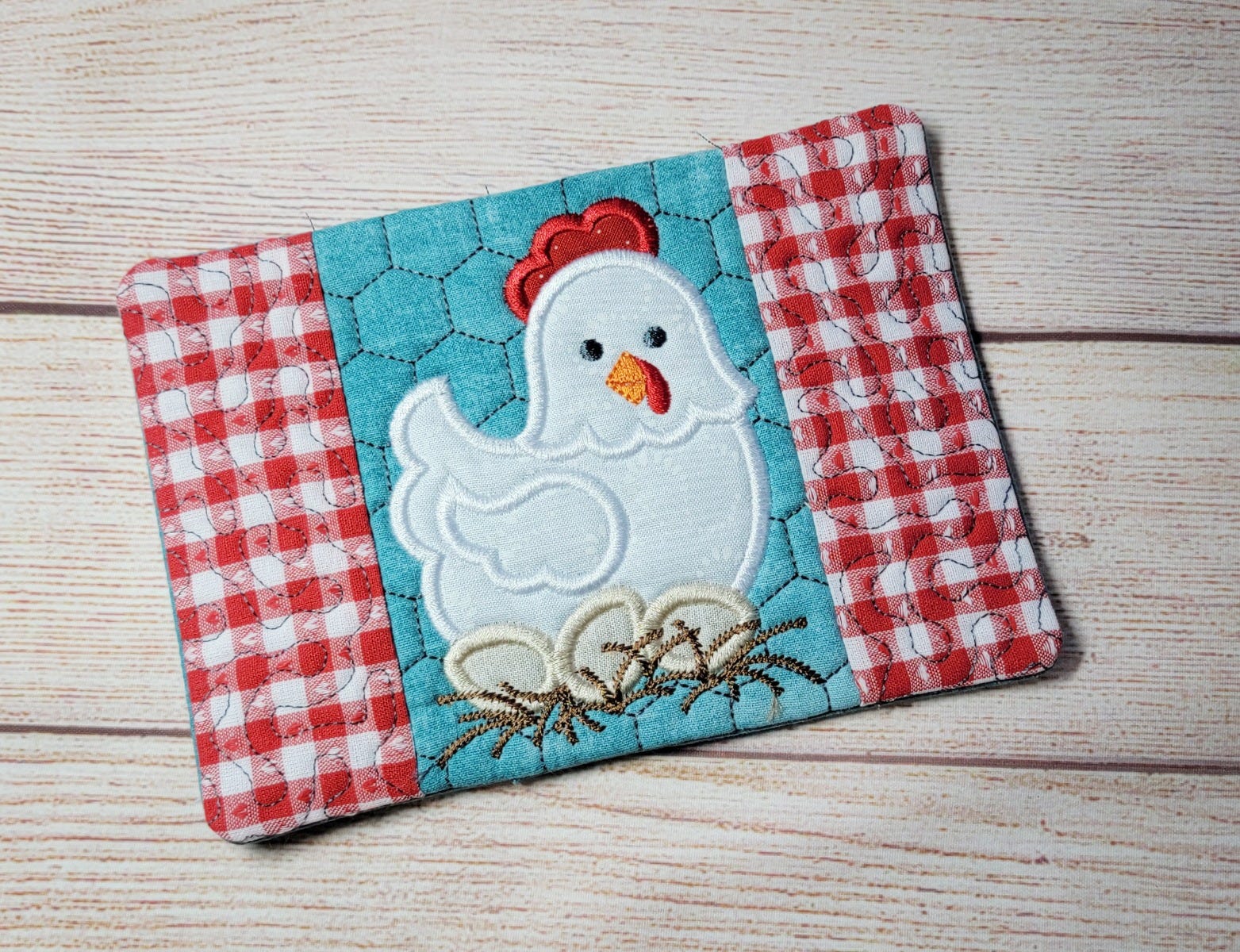 Fun and whimsical Chickens themed mug rug available in five hoop sizes: 5x7 hoop, 6x10 hoop, 7x12 hoop, 8x12 hoop and 9.5x14 hoop.