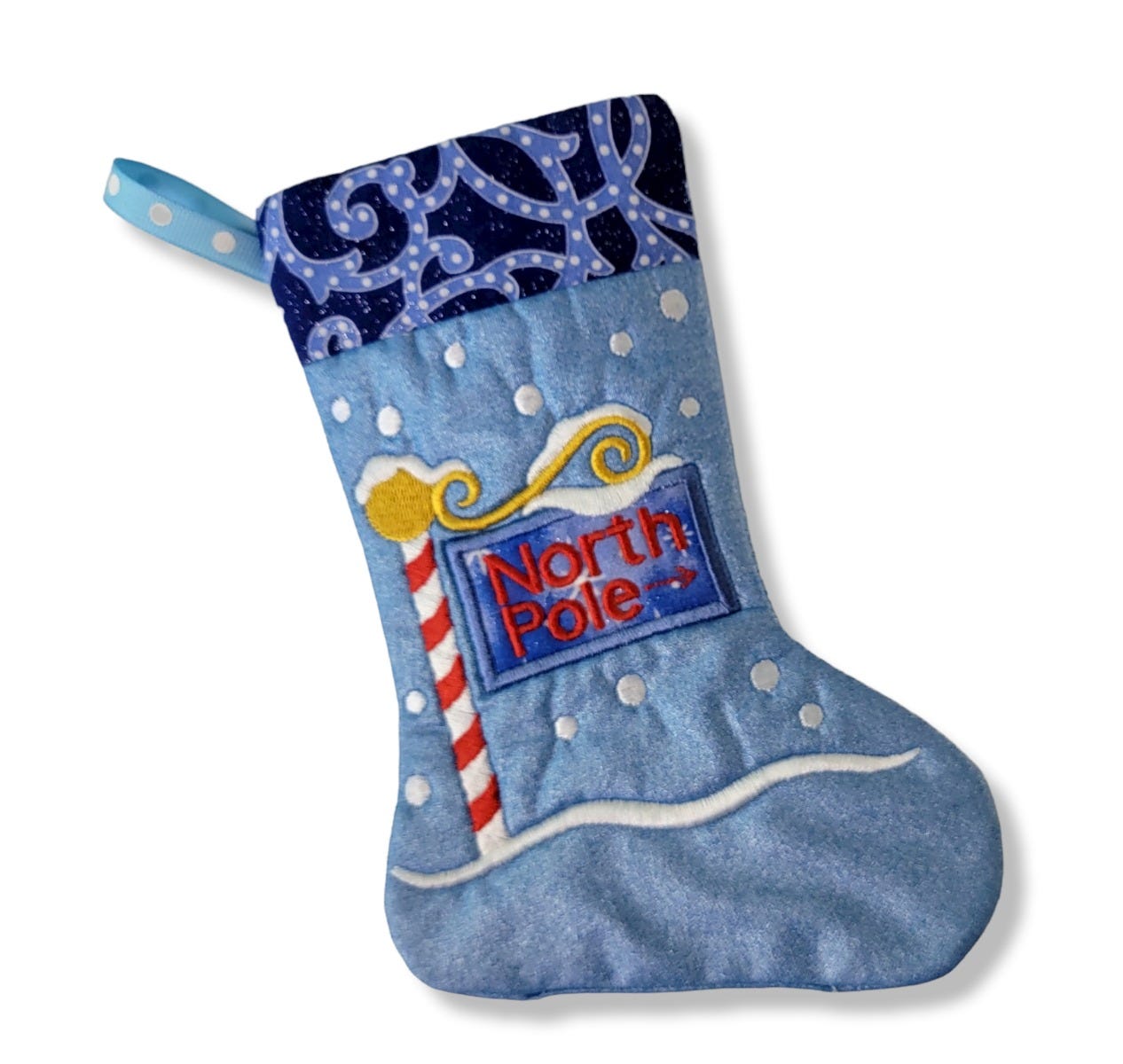 This sweet and simple ITH stocking is fully lined with no exposed seams! The North Pole sign is applique. (See below for more ITH Christmas Stockings!)