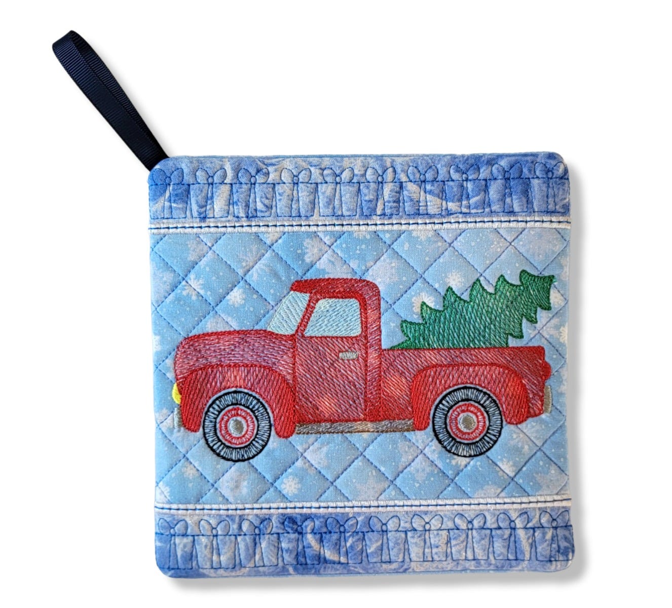Give your kitchen a warm cozy feeling with our Christmas Truck Pot Holder! This pot holder features sketch fill patterns; therefore we recommend a simple, tone-on-tone print for the background fabric and coordinating thread color for the quilting as they may show through the design.