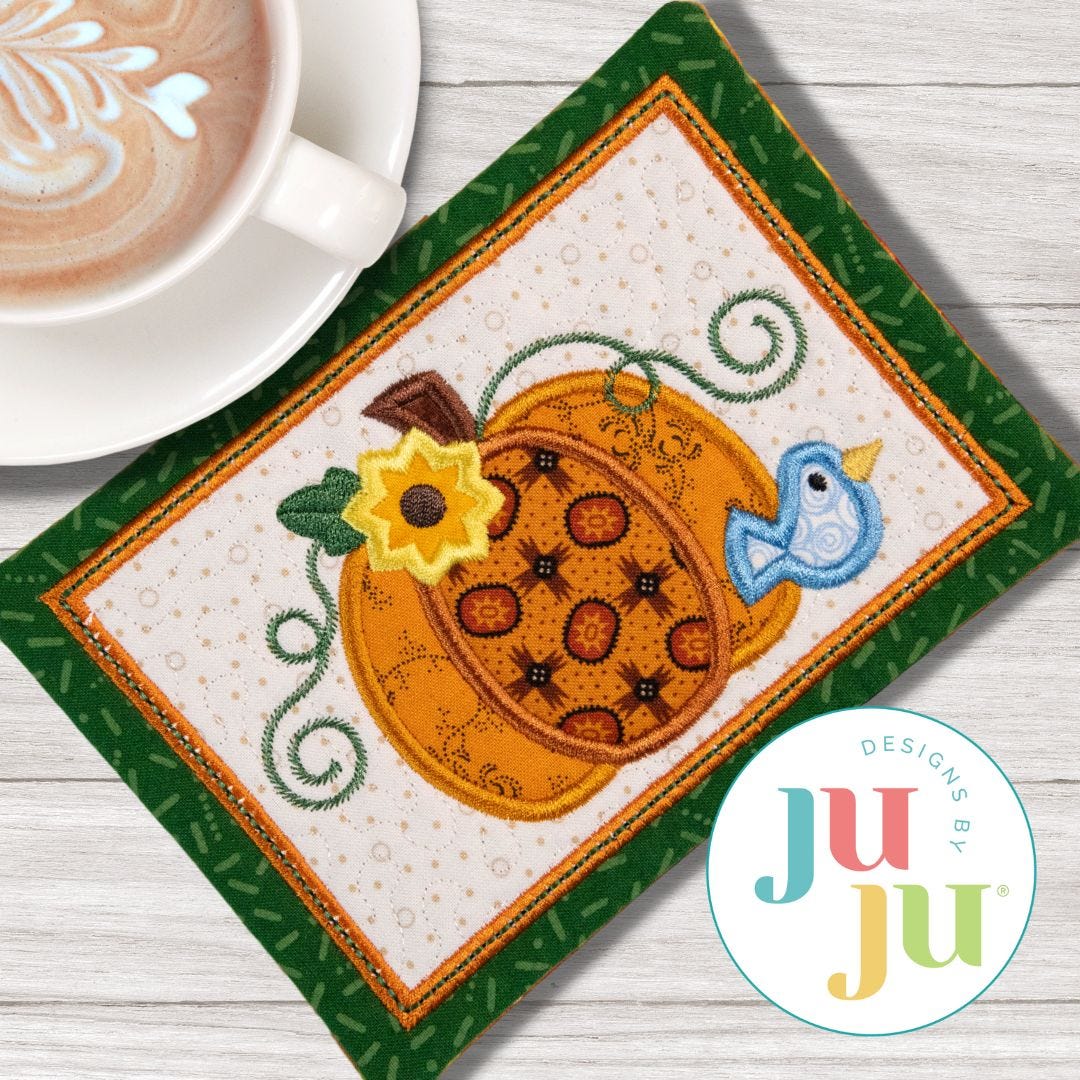 It features an applique pumpkin, flower and bird. Only one hooping required, with no additional sewing. Complete step by step PDF photo tutorial included with your download.