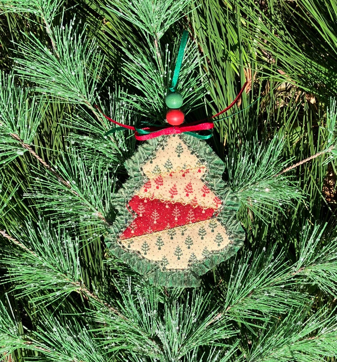 Skip the tinsel and decorate your tree with our new Crazy Patch Christmas Ornaments! This tree shaped ornament uses the "stitch-and-flip" method for piecing four different scraps of fabric in a crazy patch style, with decorative motif stitching over the seams and a heavy bean stitch outline.