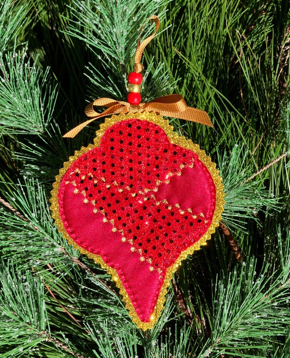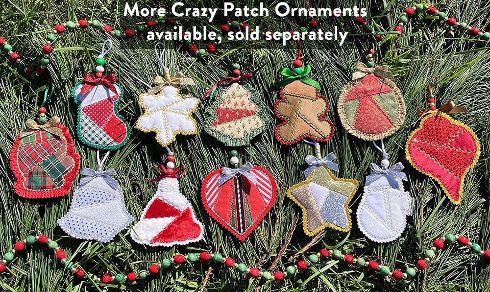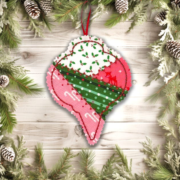 Skip the tinsel and decorate your tree with our new Crazy Patch Christmas Ornaments! This finial shaped ornament uses the "stitch-and-flip" method for piecing four different scraps of fabric in a crazy patch style, with decorative motif stitching over the seams and a heavy bean stitch outline.