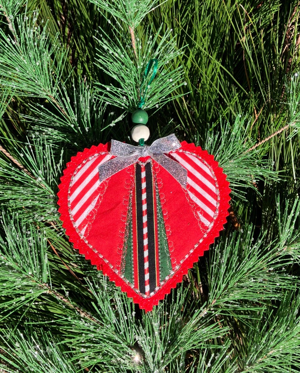 Skip the tinsel and decorate your tree with our new Crazy Patch Christmas Ornaments! This heart shaped ornament uses the "stitch-and-flip" method for piecing four different scraps of fabric in a crazy patch style, with decorative motif stitching over the seams and a heavy bean stitch outline.