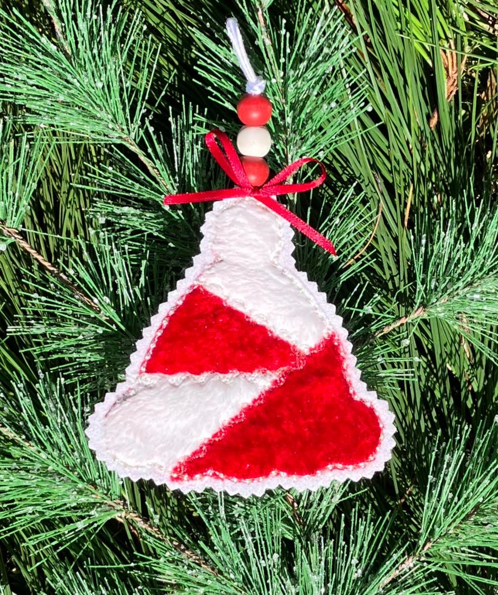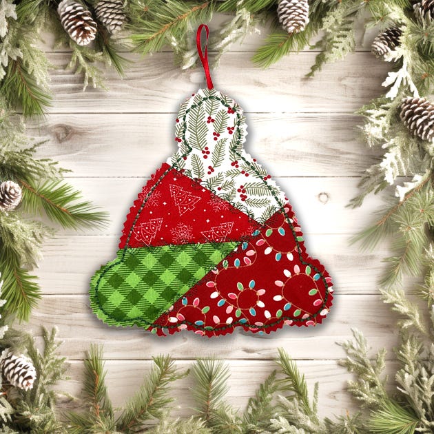 Skip the tinsel and decorate your tree with our new Crazy Patch Christmas Ornaments! This hat shaped ornament uses the "stitch-and-flip" method for piecing four different scraps of fabric in a crazy patch style, with decorative motif stitching over the seams and a heavy bean stitch outline.