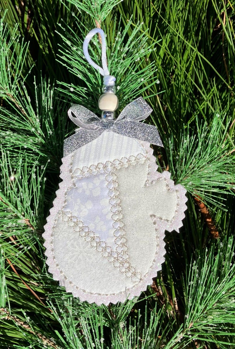 Skip the tinsel and decorate your tree with our new Crazy Patch Christmas Ornaments! This snowman shaped ornament uses the "stitch-and-flip" method for piecing four different scraps of fabric in a crazy patch style, with decorative motif stitching over the seams and a heavy bean stitch outline.