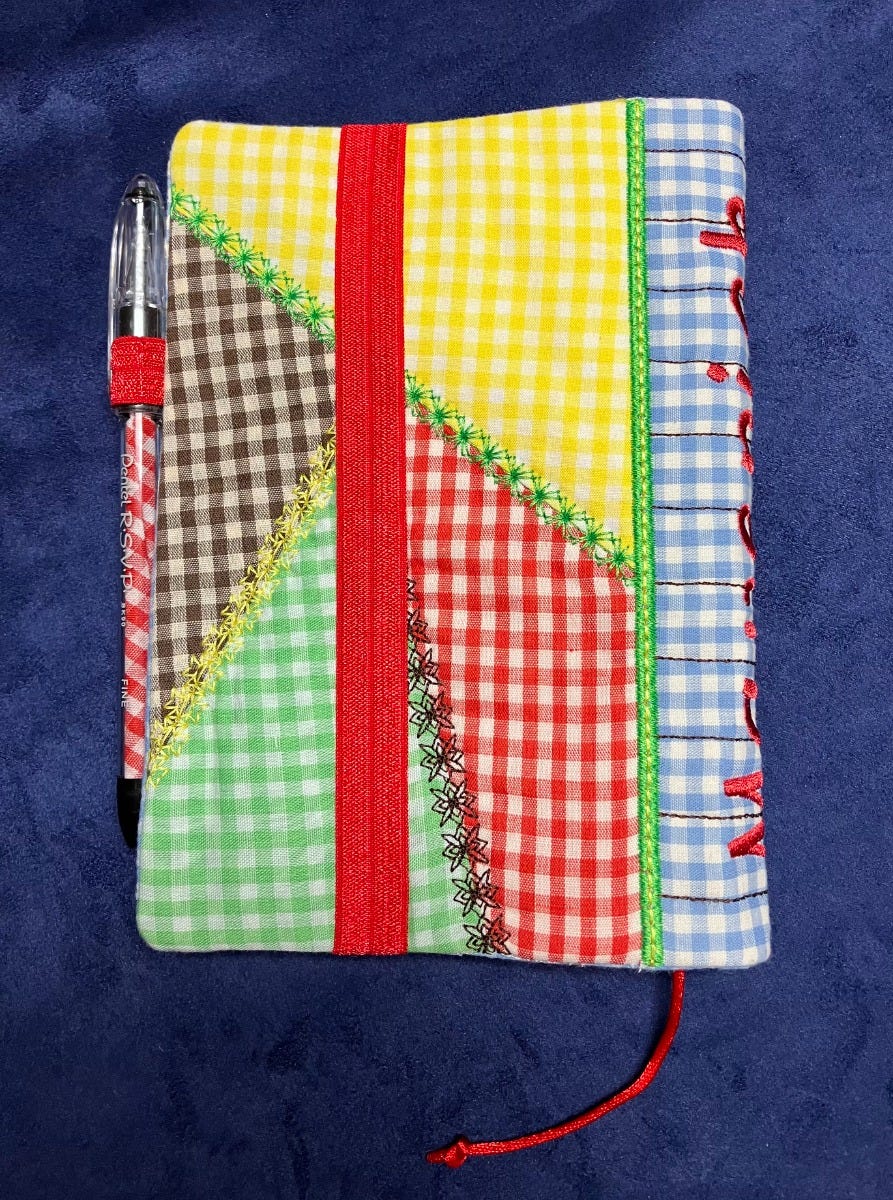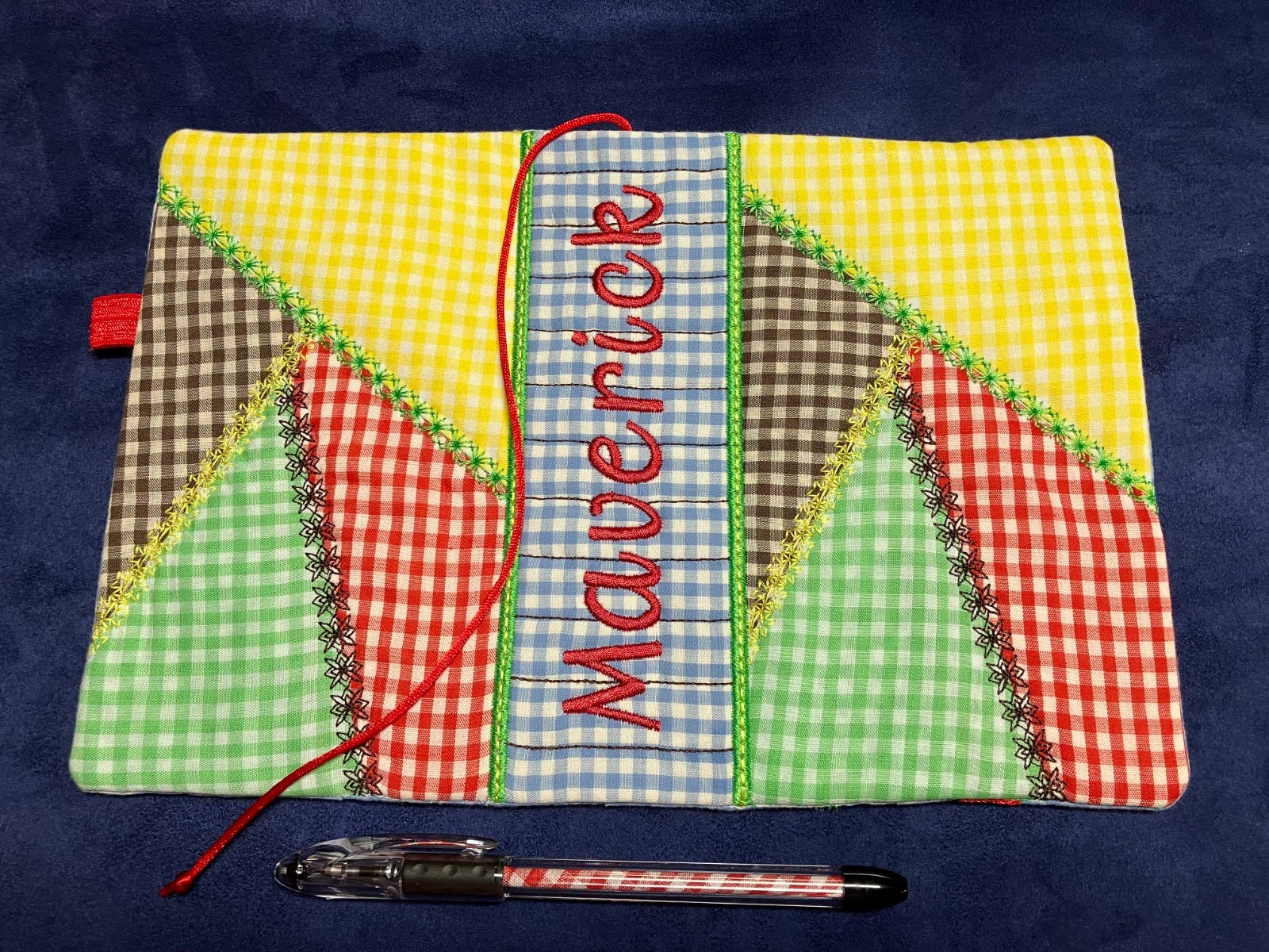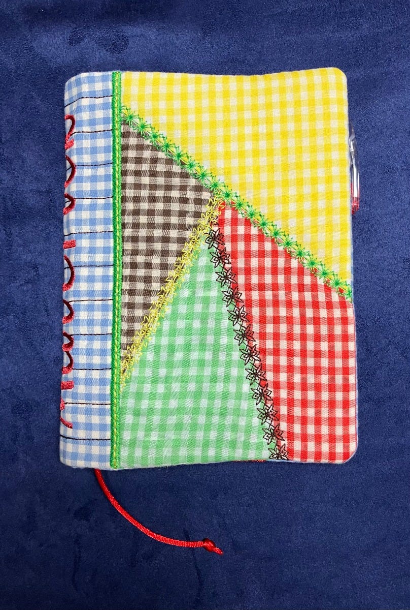 The back cover and front cover feature crazy patch applique with decorative motif stitching over the seams. Includes 2 different spine pattern options (vertical stripes and horizontal stripes) each in 2 sizes.