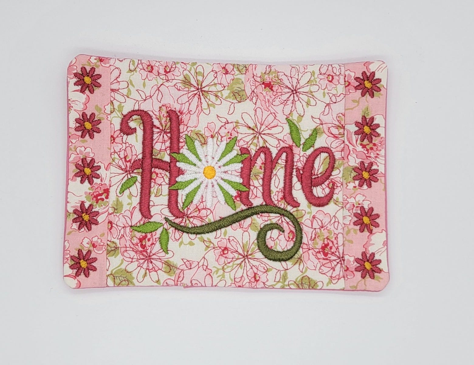 Available in five hoop sizes: 5x7 hoop, 6x10 hoop, 7x12 hoop, 8x12 hoop, and 9.5x14 hoop. Mug rugs are made completely in the hoop. Detailed, step by step photo instructions are included in your download.