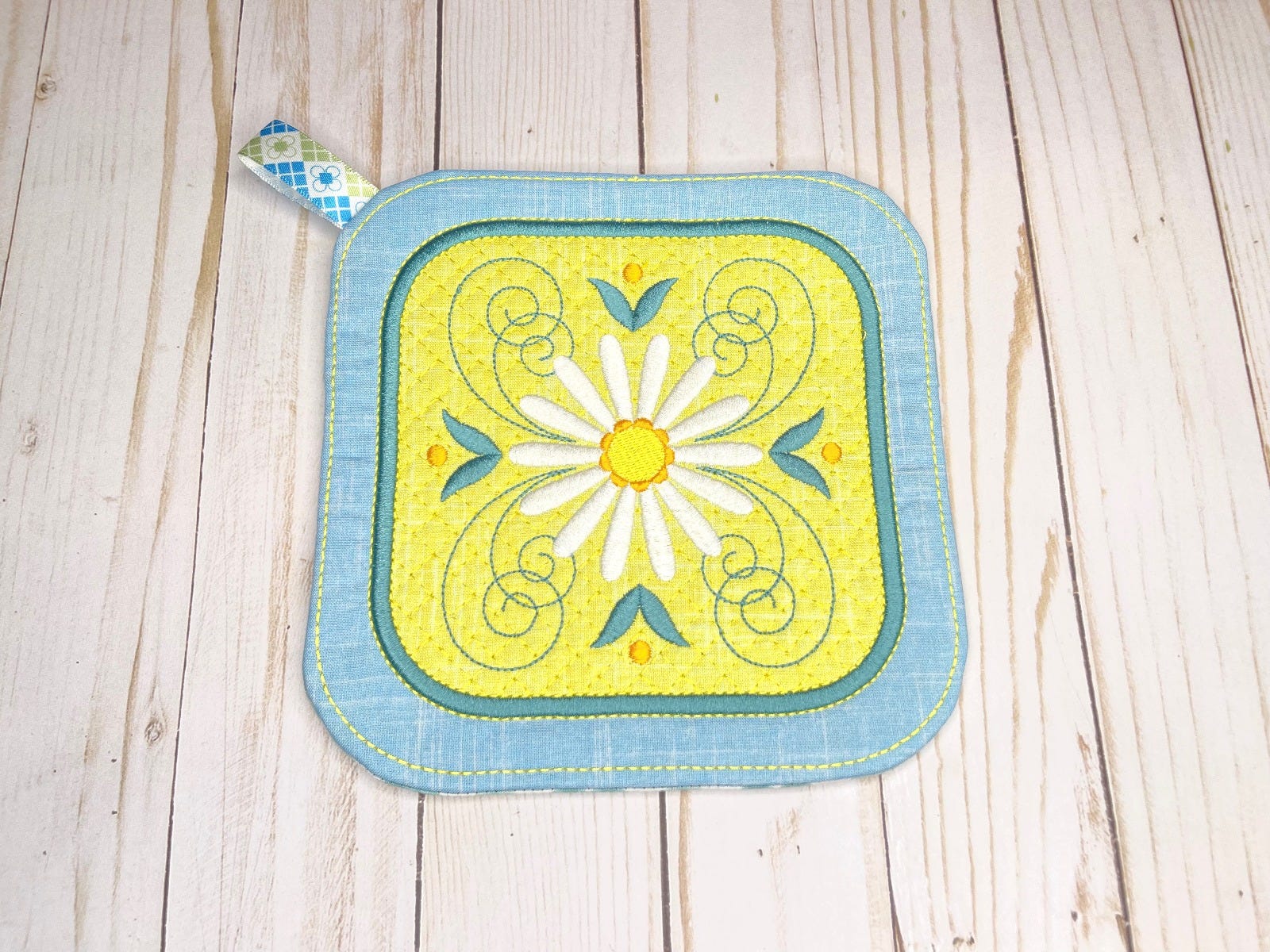 Brighten your home with the freshness of daisies with the new Daisy Potholder 1! Customize the pot holder with fun colors and fabric patterns, or coordinate with other ITH daisy projects!