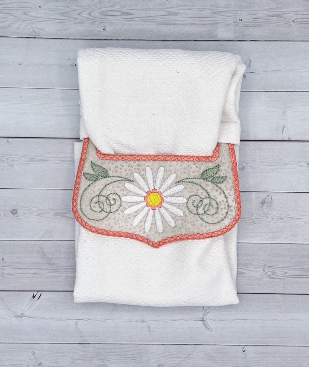 Includes two designs: one with a daisy and elegant swirls, and one that brightens your "Home" with the freshness of daisies. Customize the towel toppers with fun colors and fabric patterns, or coordinate with other ITH home decor projects!