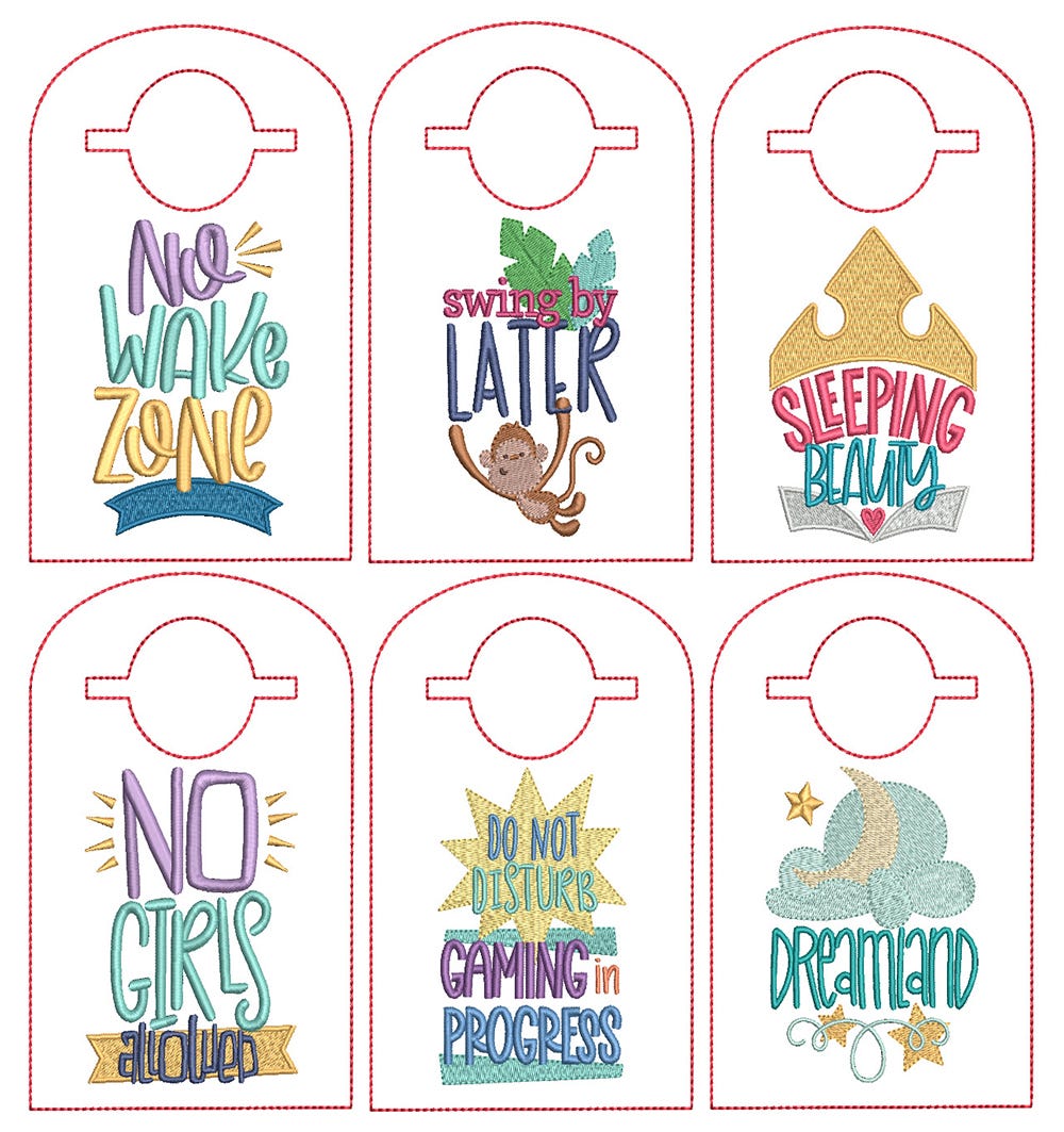 Looking for a fun way to welcome (or warn) visitors who come to visit? Youāll love our sassy sayings doorknob hangers! Quick and easy to stitch and made completely in the hoop. Complete photo tutorial included. Recommended fabrics: felt, canvas, burlap, or desired fabric