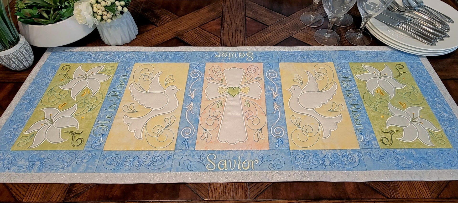 Our Easter Blessings Table Runner brings together an elegant cross, doves, and lilies, giving your table a beautiful setting for Easter. Using combinations of bright or pastel fabrics, and fun or elegant fabric patterns will create a unique and beautiful project. Coordinate the table runner with the Easter Blessings Placemat to create a gorgeous Easter table setting.