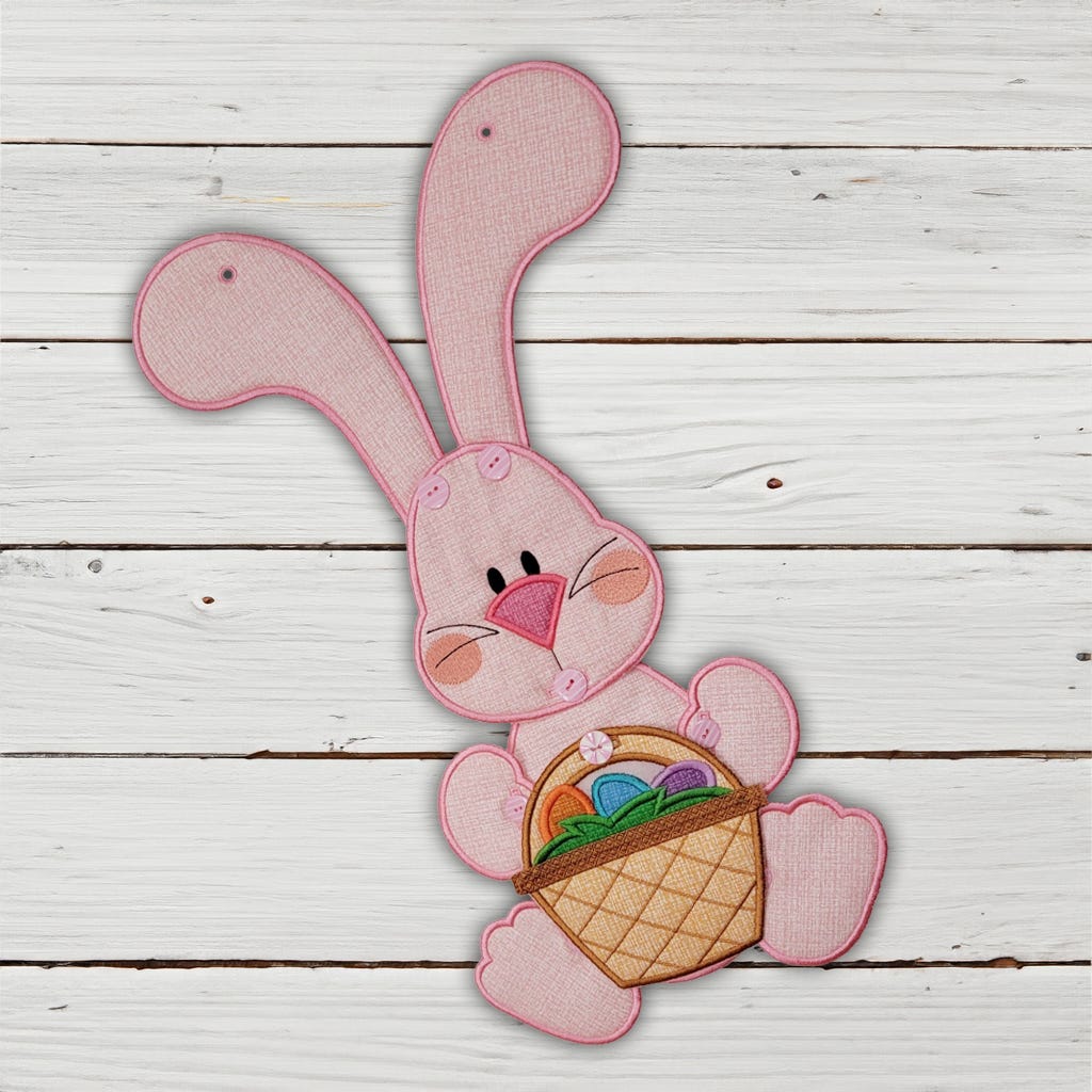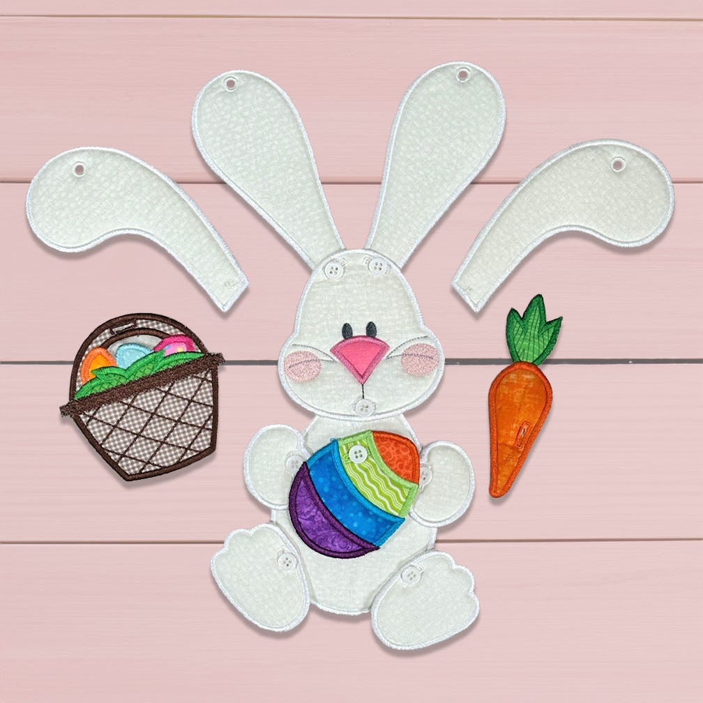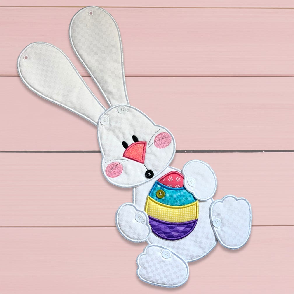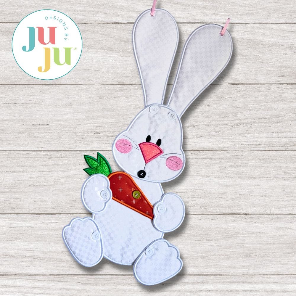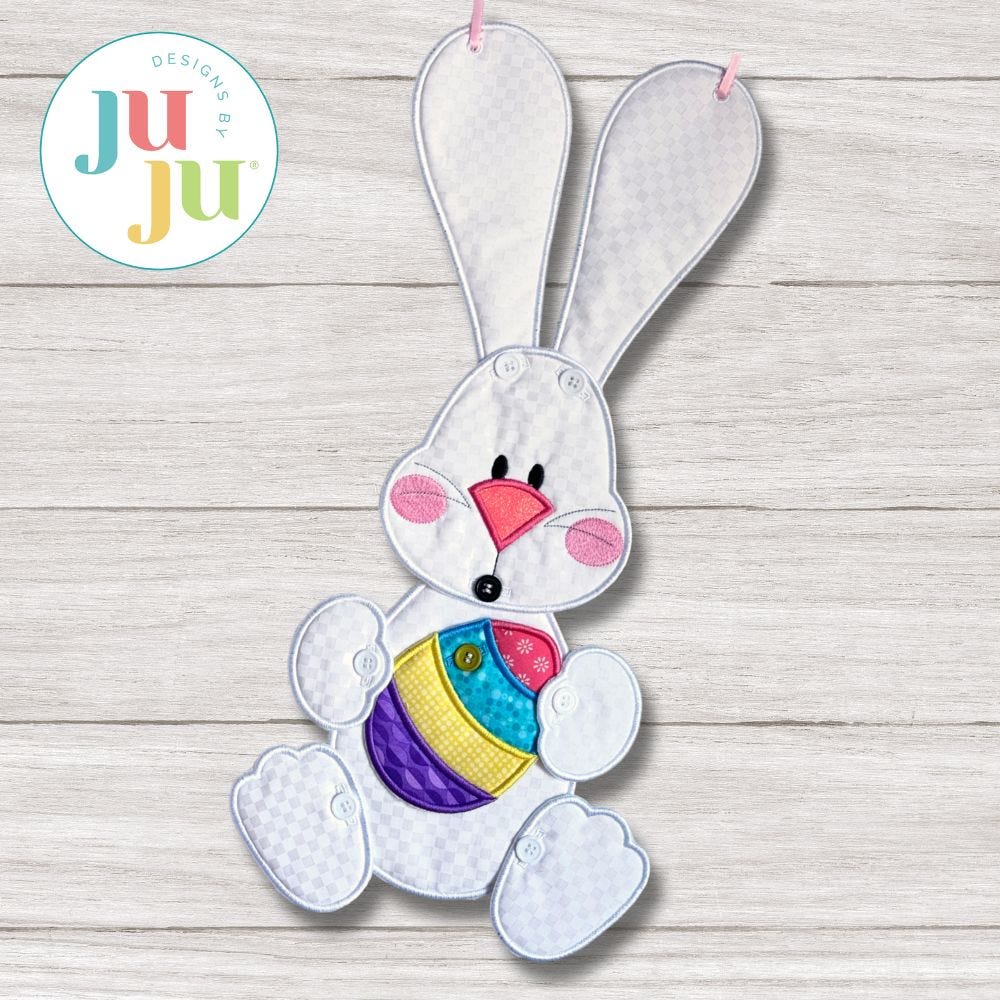 Requires 5-6 hoopings: Bunny's head, body, ears, paws the item he holds are stitched entirely in the hoop. The only additional hand sewing required is adding buttons once the pieces are complete. Easy to make and assemble! Complete step by step PDF photo tutorial included with your download. A Designs by JuJu Exclusive.
