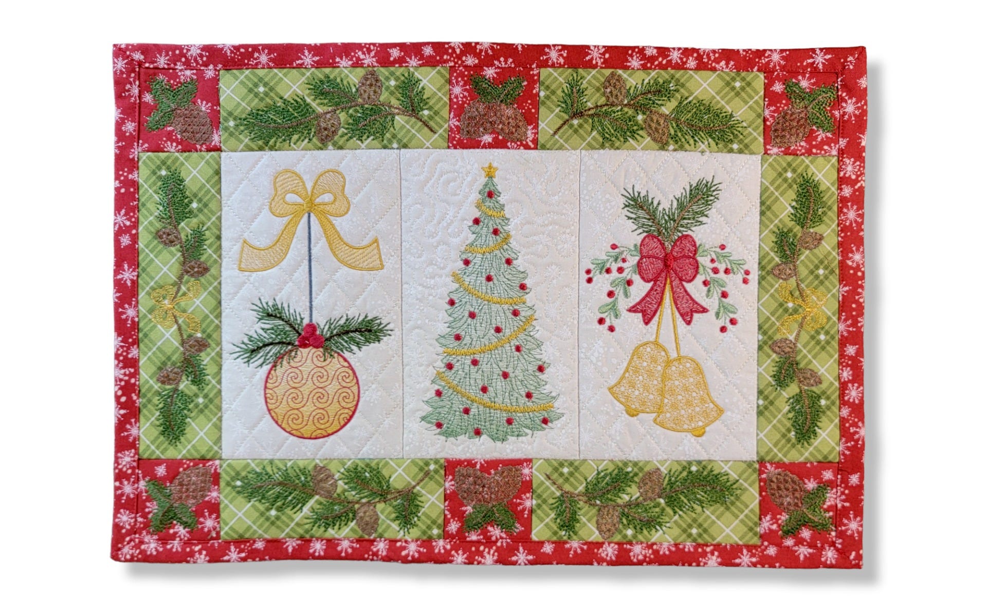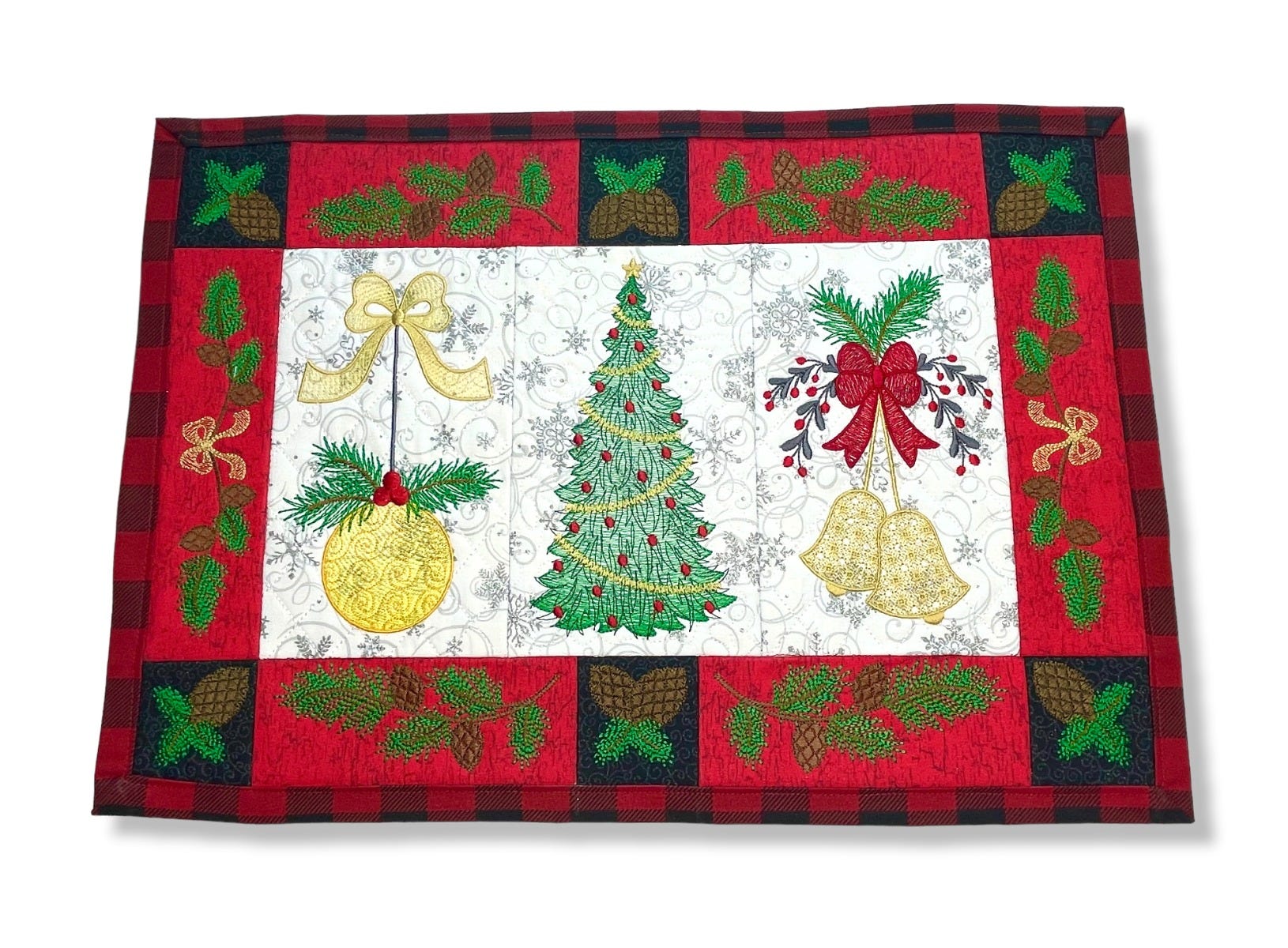 Welcome visitors to your home for the holidays with our Farmhouse Christmas Placemat! Coordinate fabric patterns and colors to create a unique table setting. This placemat features sketch fill and light density fill patterns, allowing for a quicker stitch out than solid fill patterns. Therefore we recommend simple, tone-on-tone prints for the background fabrics and coordinating thread for the quilting, as they may show through the designs.