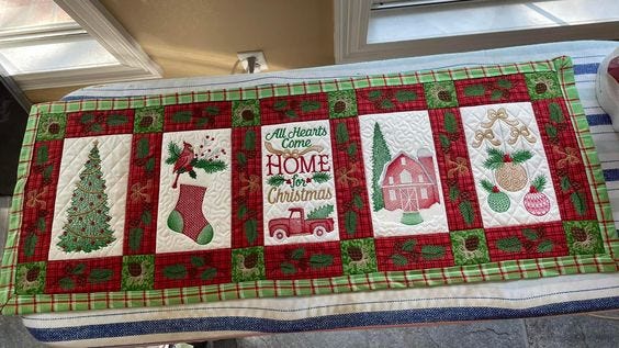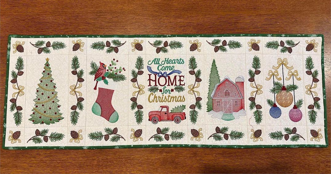 Everyone will feel at home for Christmas with our Farmhouse Christmas Table Runner! Coordinate fabric patterns and colors to create a unique table setting. This table runner features sketch fill and light density fill patterns, allowing for a quicker stitch out than solid fill patterns. Therefore we recommend simple, tone-on-tone prints for the background fabrics and coordinating thread for the quilting, as they may show through the designs.