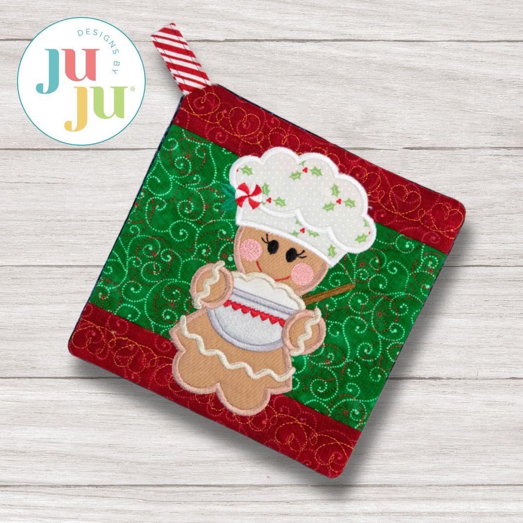 Lay a pan of fresh cookies on our Gingerbread Baker Pot Holder! (See below for more ITH Gingerbread items!)