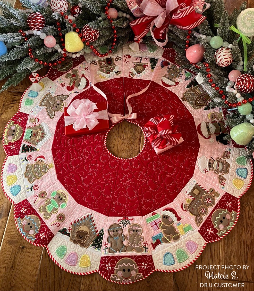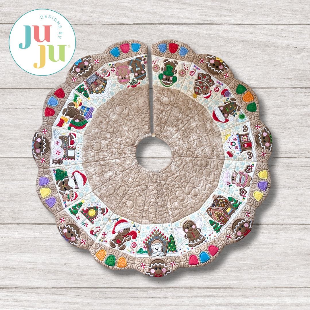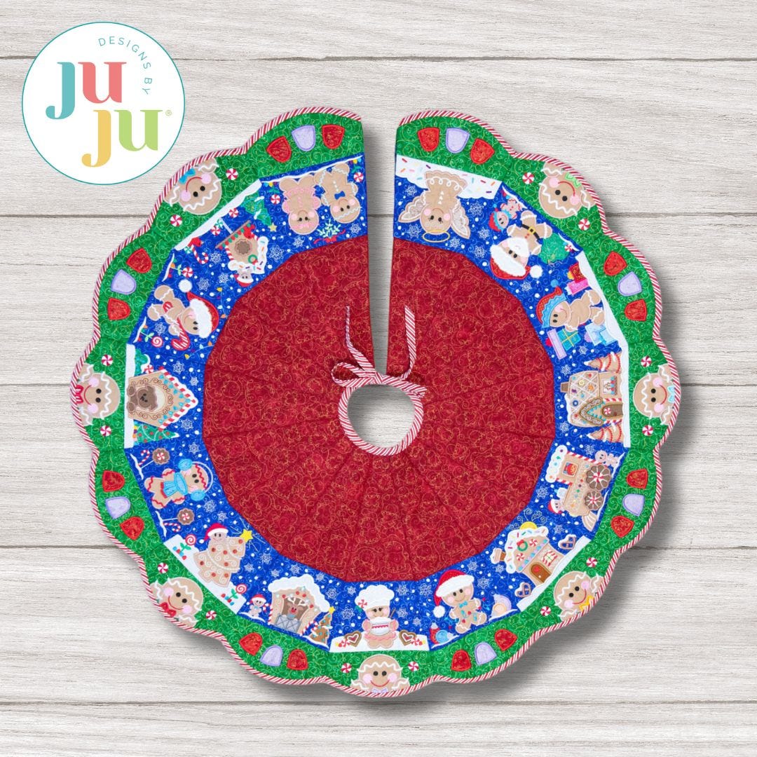 Instant heirloom! Create a beautiful Christmas tree skirt that will be a family favorite for years to come! Customize with fabrics and thread of your choice, arranging the gingerbread blocks however you'd like to make a unique project.