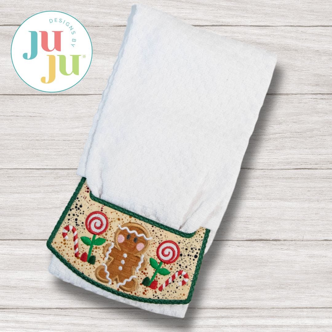 Decorate your kitchen for Christmas with our Gingerbread Wrap Around Towel Topper! This topper features an applique gingerbread man with embroidered candy. (See below for more ITH Gingerbread items!)