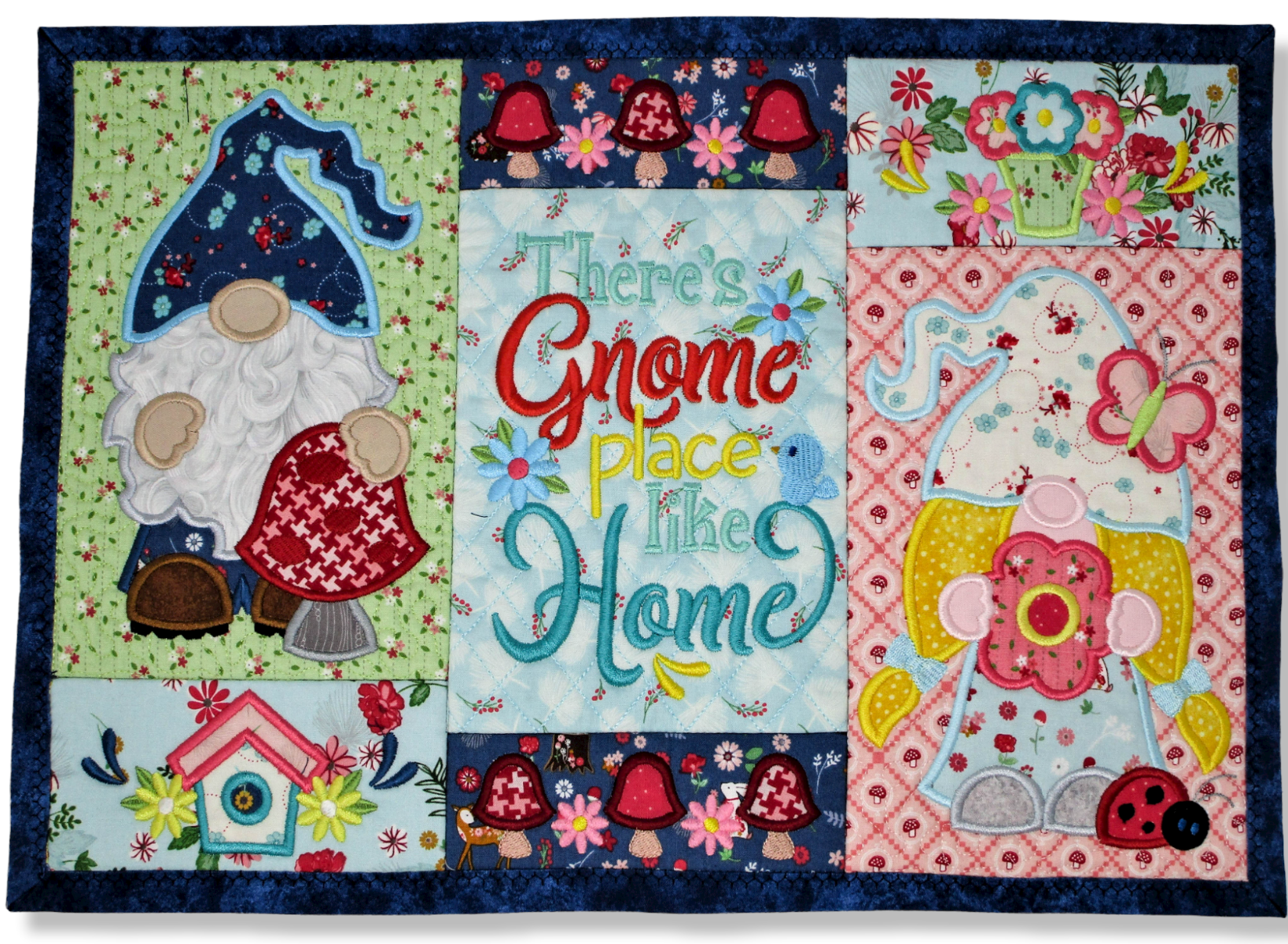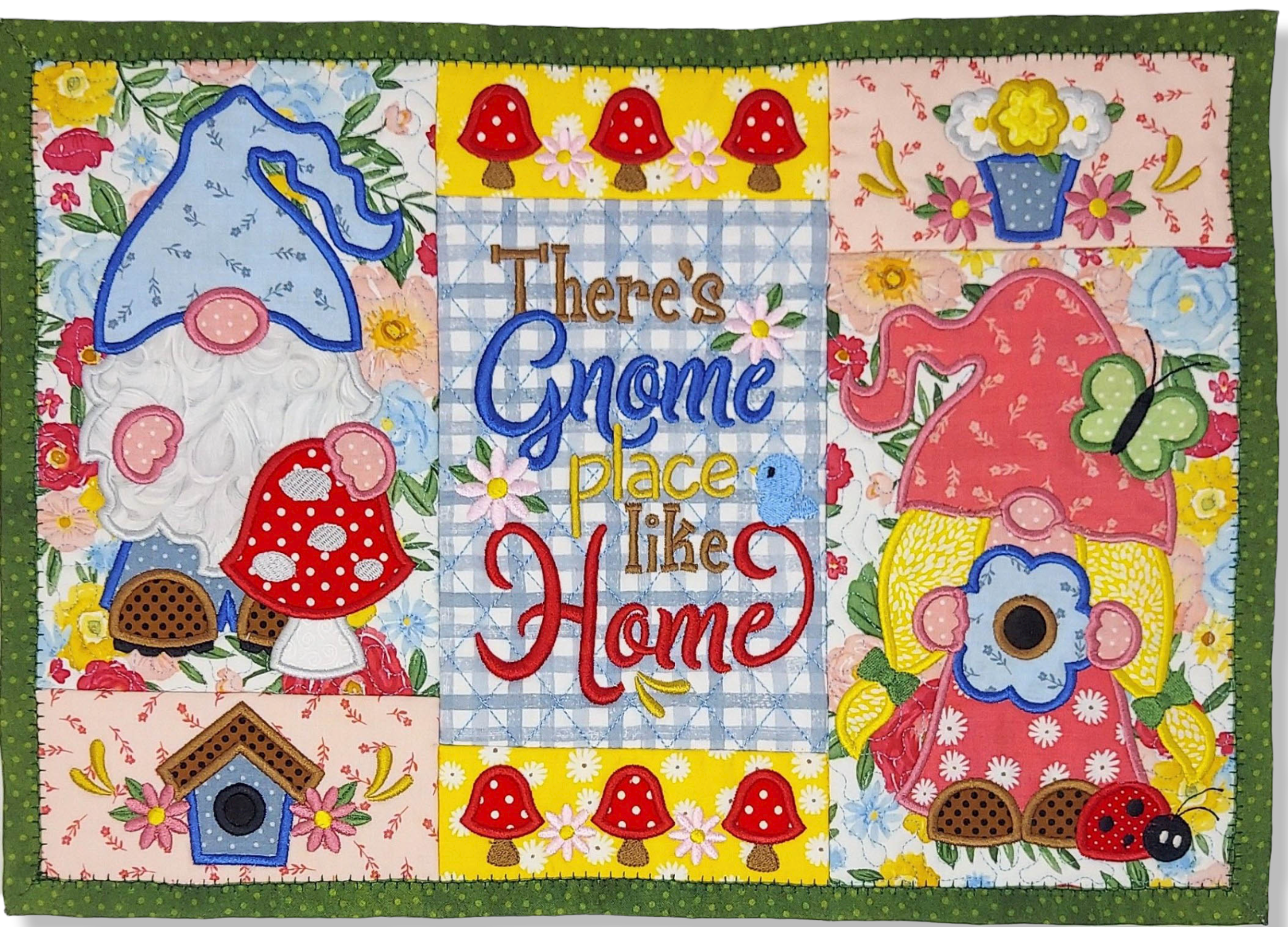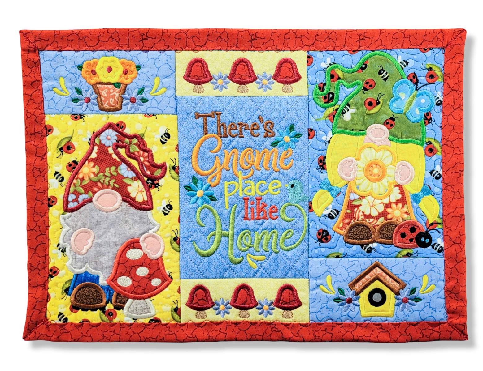 There's gnome better place to set down your plate than on our Gnome Placemat! Coordinate fabric patterns and colors to create unique placemats that will have everyone smiling! This placemat features several applique designs along with satin, bean and fill stitch design elements.