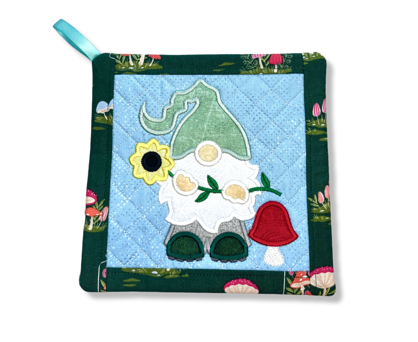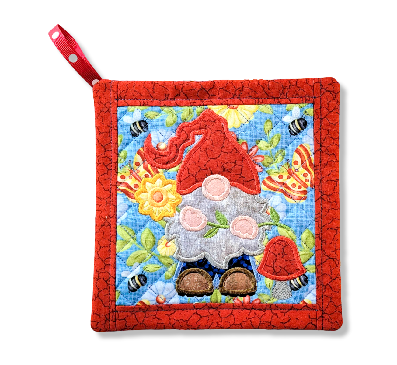 There's gnome better place to set down your dish than on our Gnome Pot Holder! This pot holder features applique design elements. Customize the pot holder with fun colors and fabric patterns, or coordinate with other ITH Gnome projects!