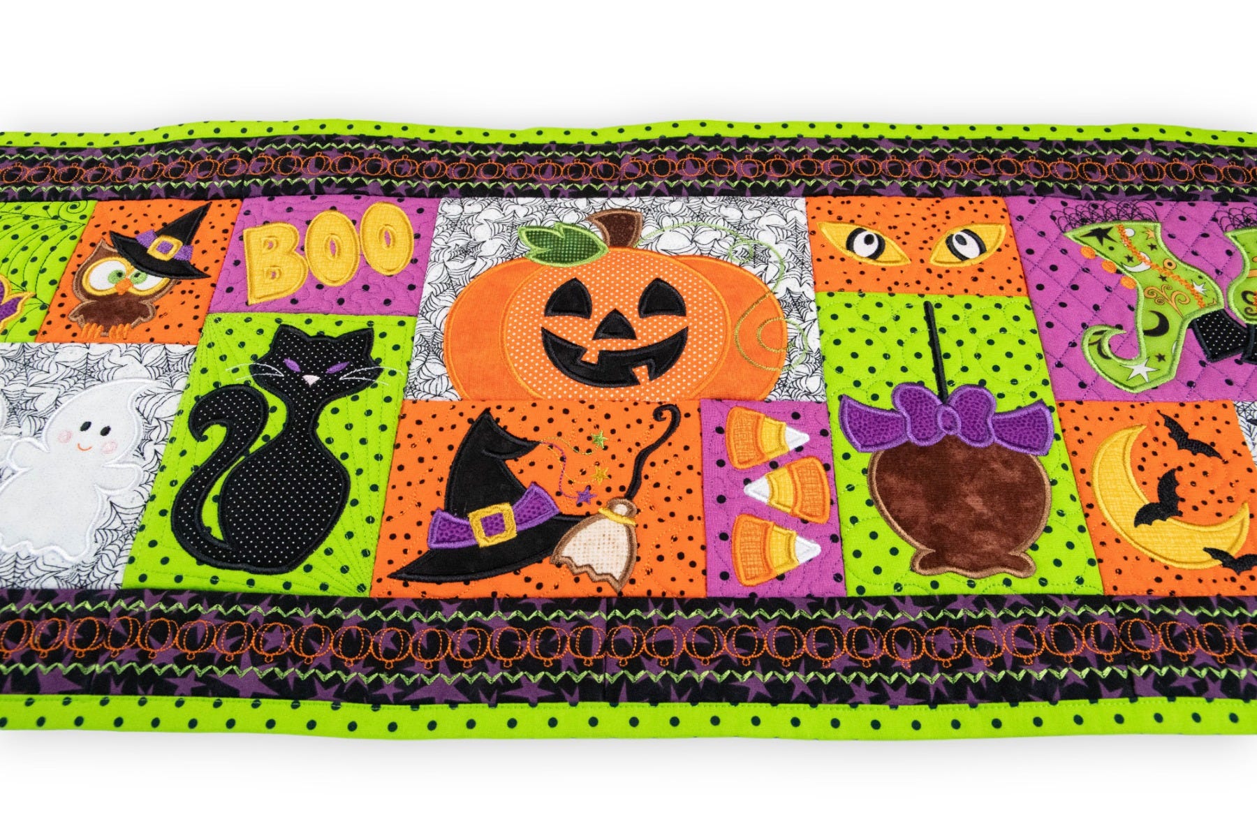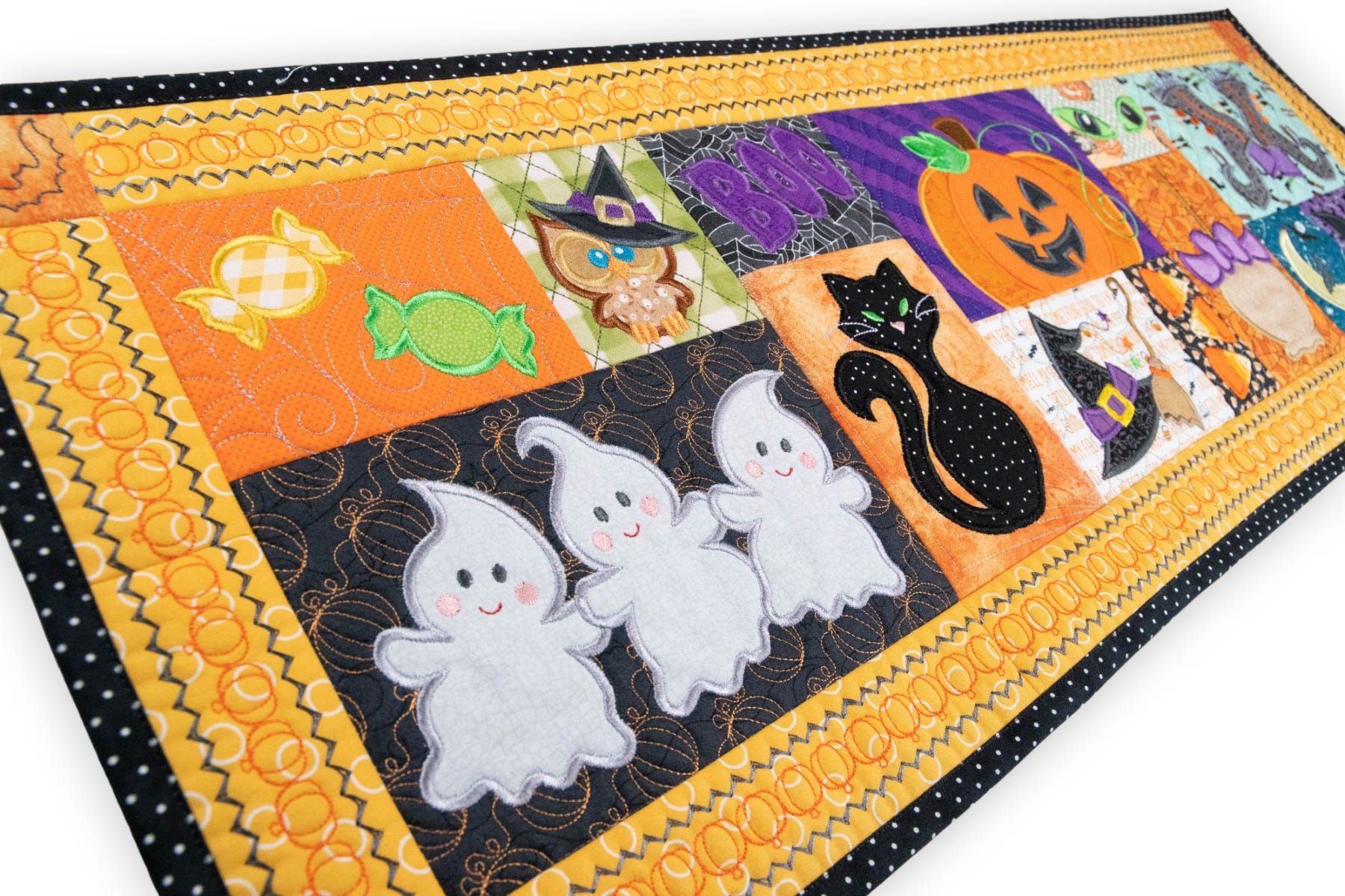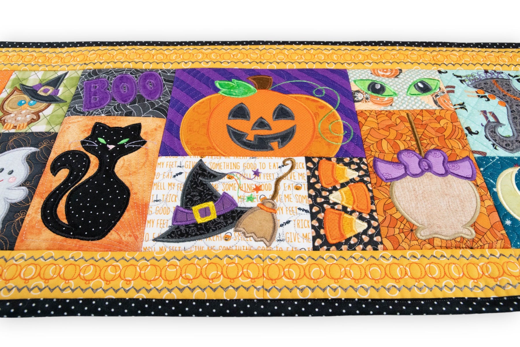 Decorate your dining room for Halloween with our Halloween Table Runner! This project features applique ghosts, owl, cat, jack-o-lantern, witch hat and boots, candy corn, eyes, caramel apple, moon and bat blocks with embroidered accents in the border.