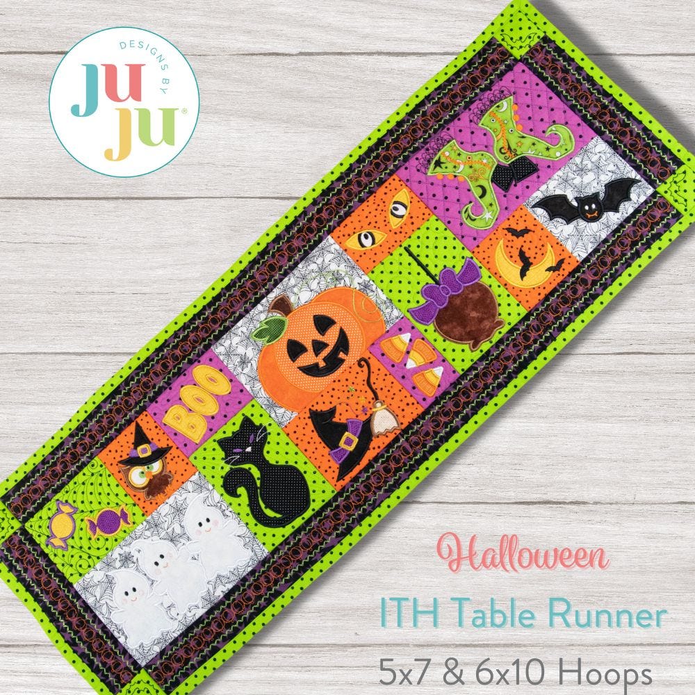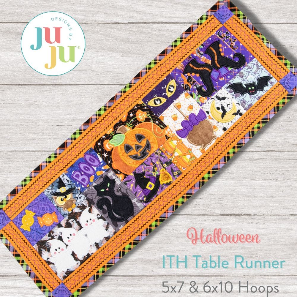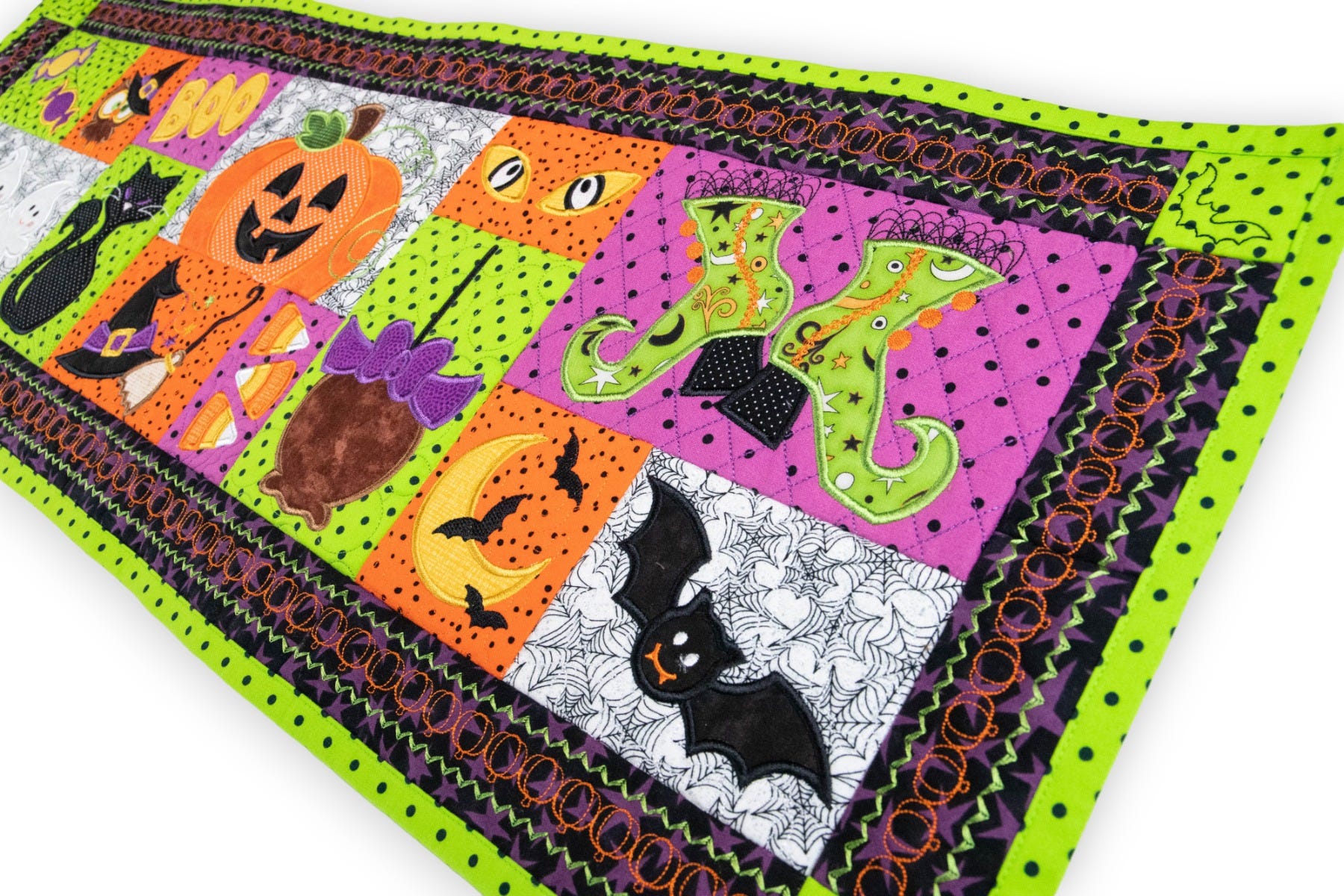 Decorate your dining room for Halloween with our Halloween Table Runner! This project features applique ghosts, owl, cat, jack-o-lantern, witch hat and boots, candy corn, eyes, caramel apple, moon and bat blocks with embroidered accents in the border.