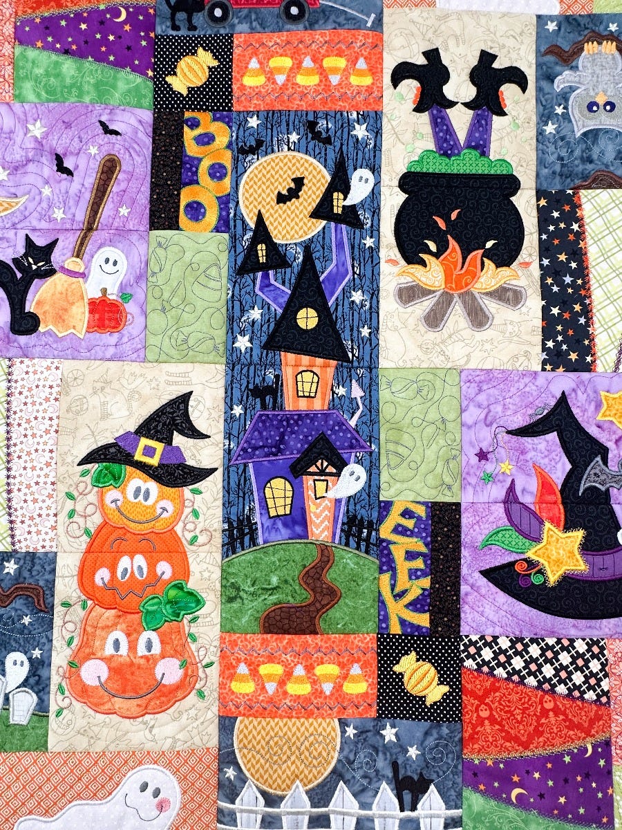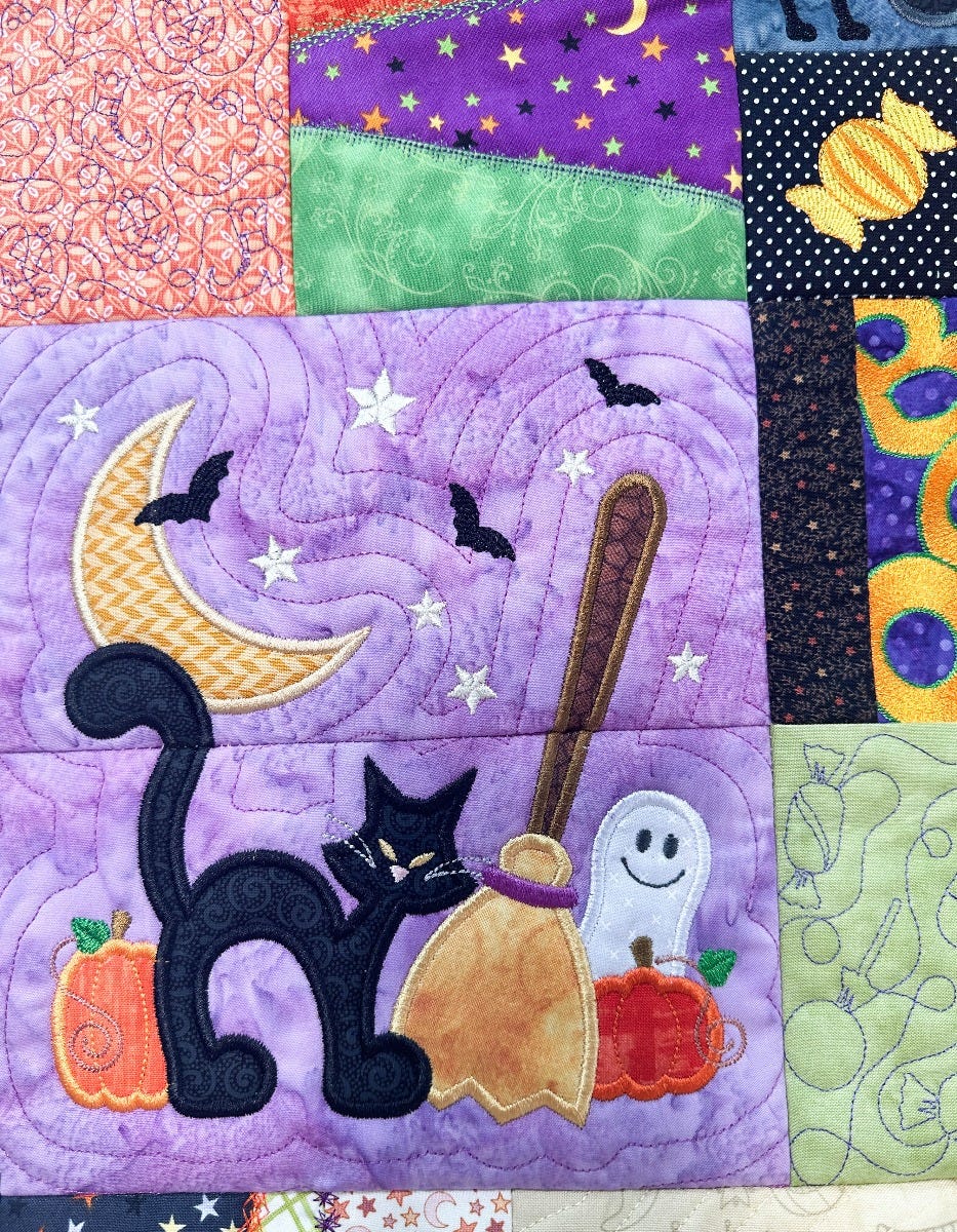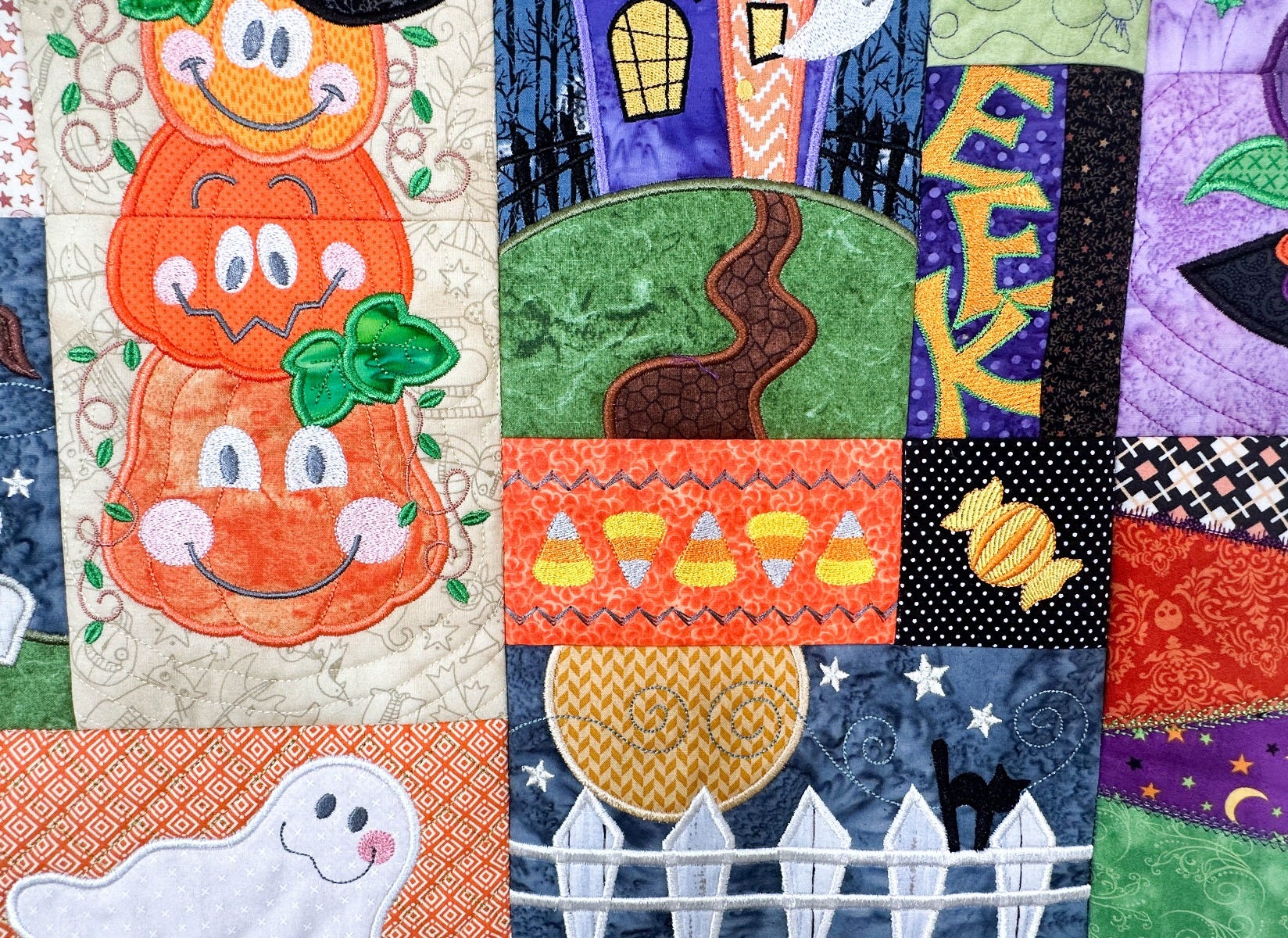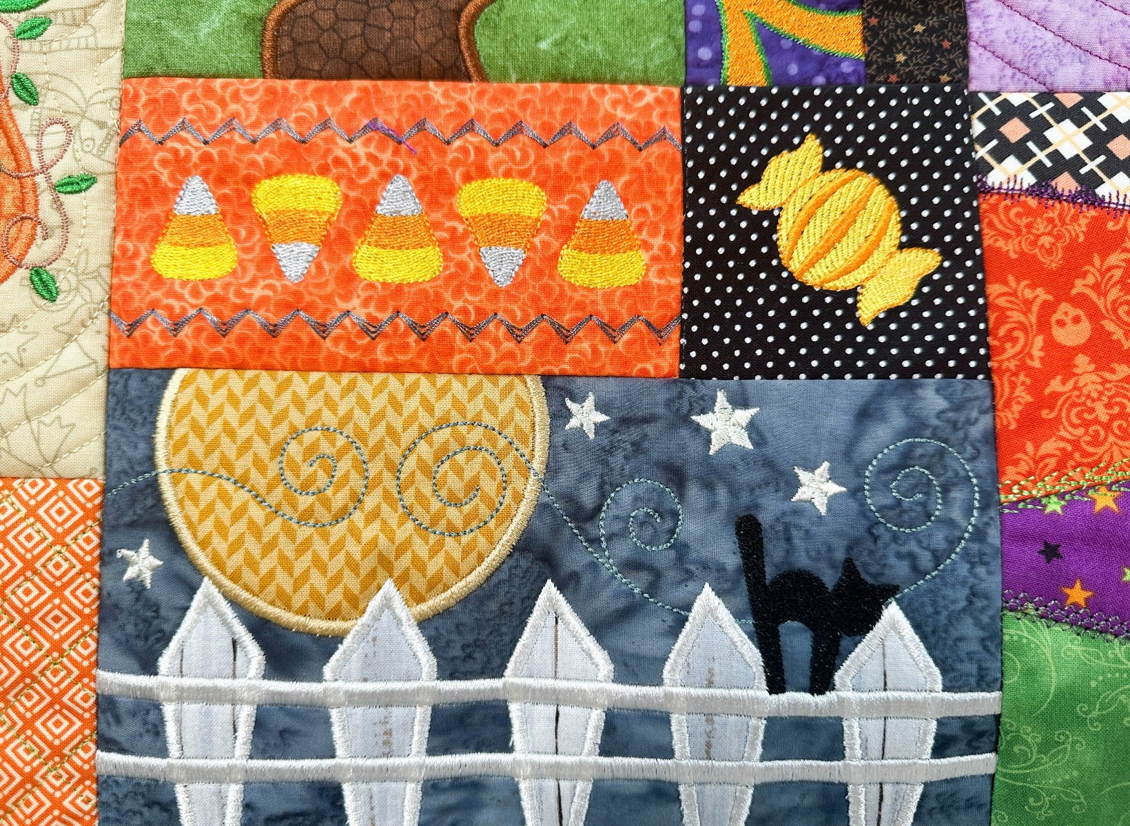 All quilting pictured (whether echo quilting, crosshatch, candy motif or pumpkin motif) are built into the block designs.