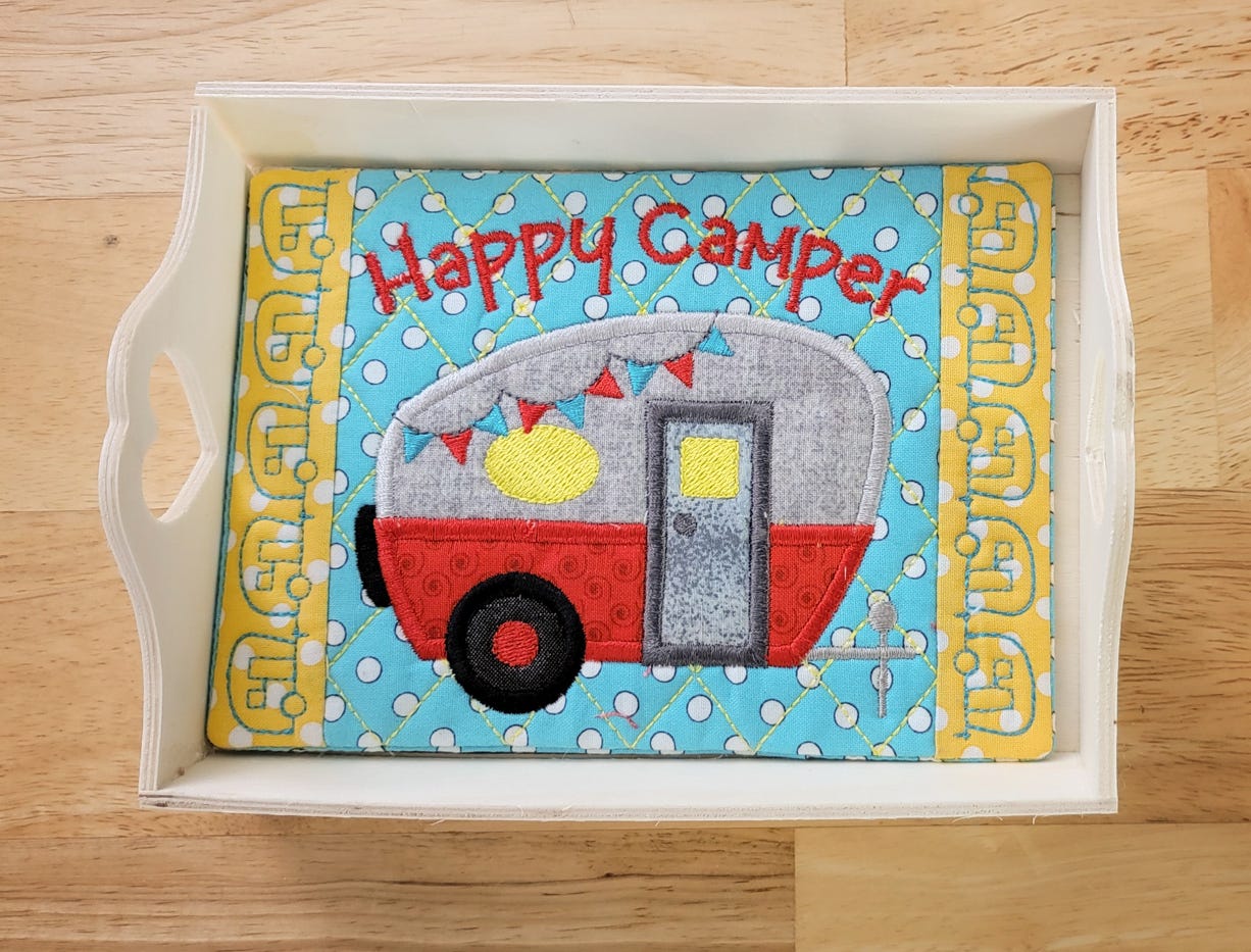 The Happy Camper Mug Rug is a fun project to brighten your day, and make everyone a "happy camper"! Available in five hoop sizes: 5x7 hoop, 6x10 hoop, 7x12 hoop, 8x12 hoop, and 9.5x14 hoop. Mug rugs are made completely in the hoop. Detailed, step by step photo instructions are included in your download.