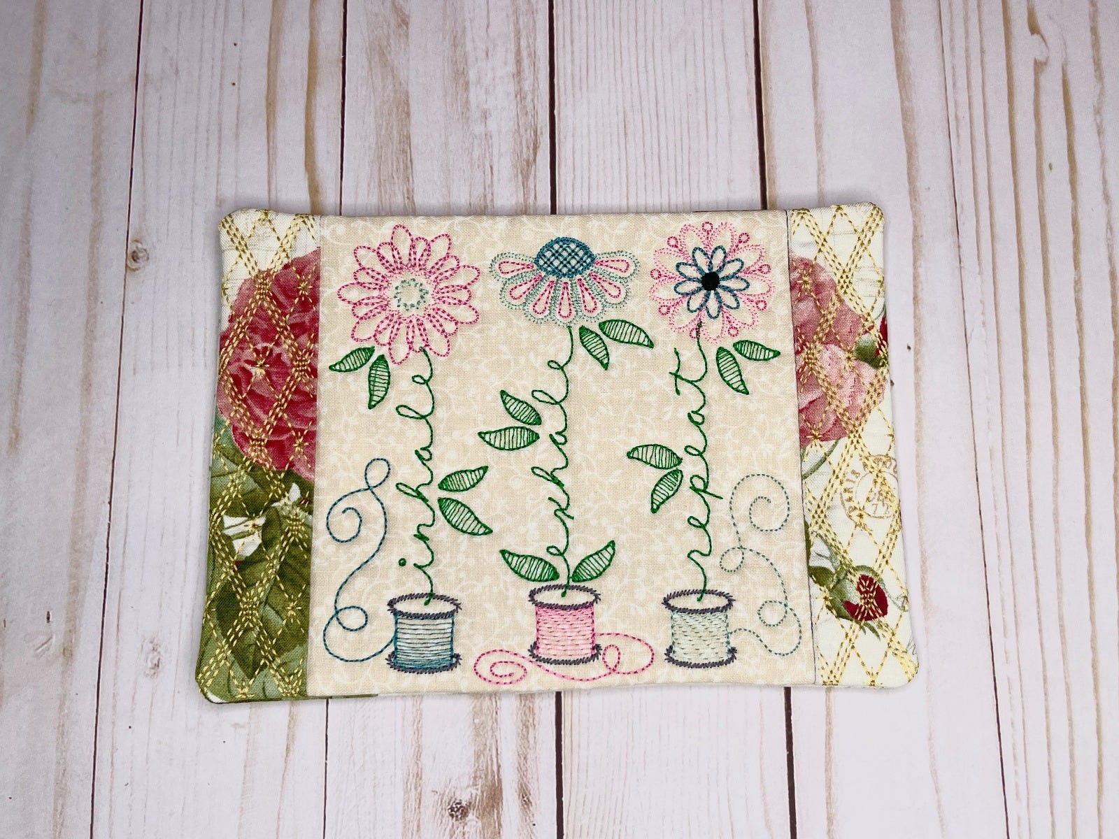A peaceful reminder to just breath every time you set down your drink on our Inhale Exhale Repeat Doodle Mug Rug!