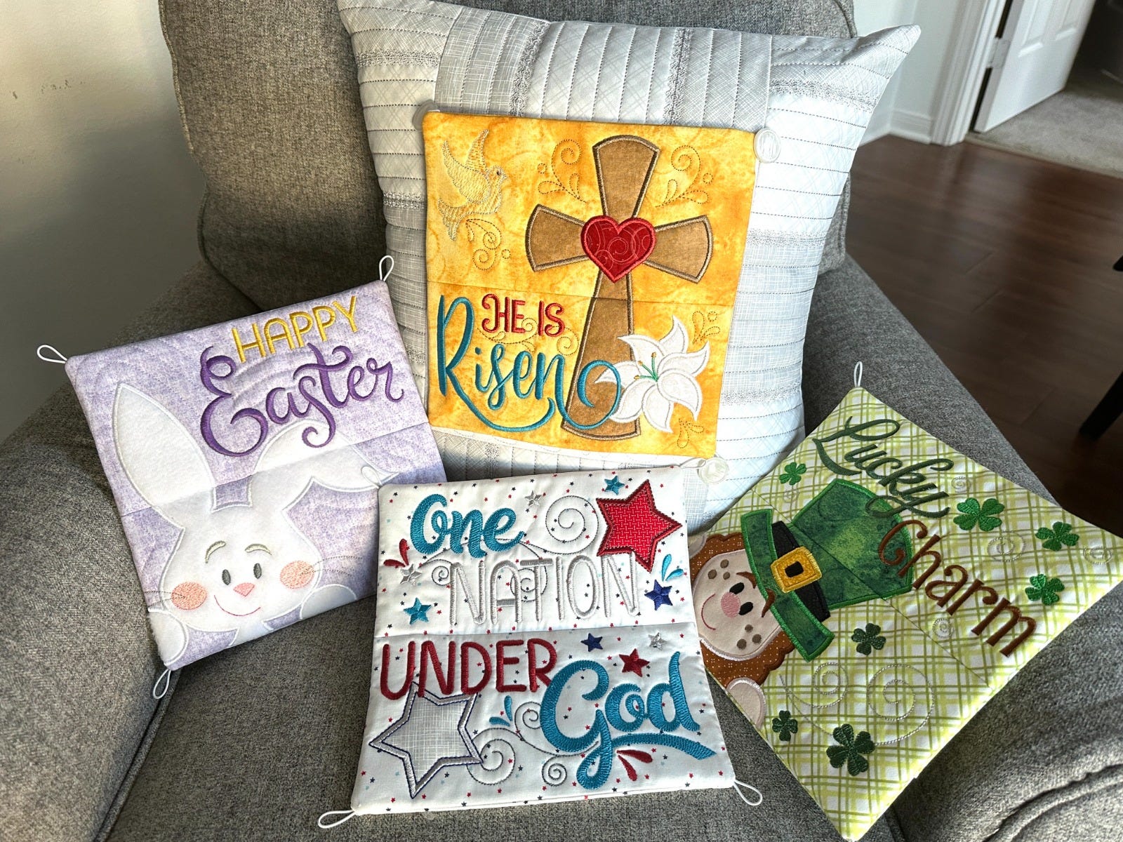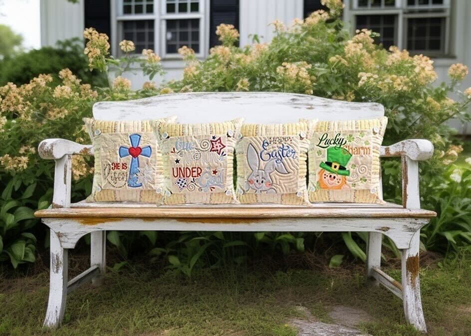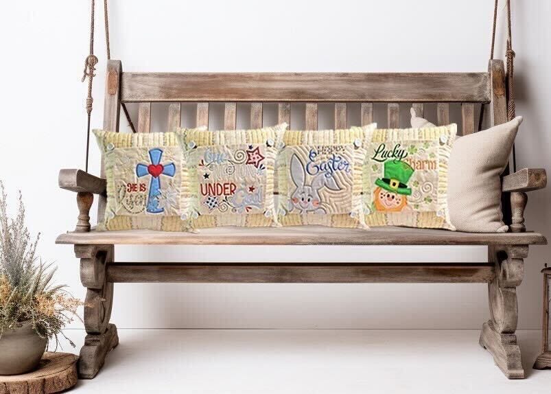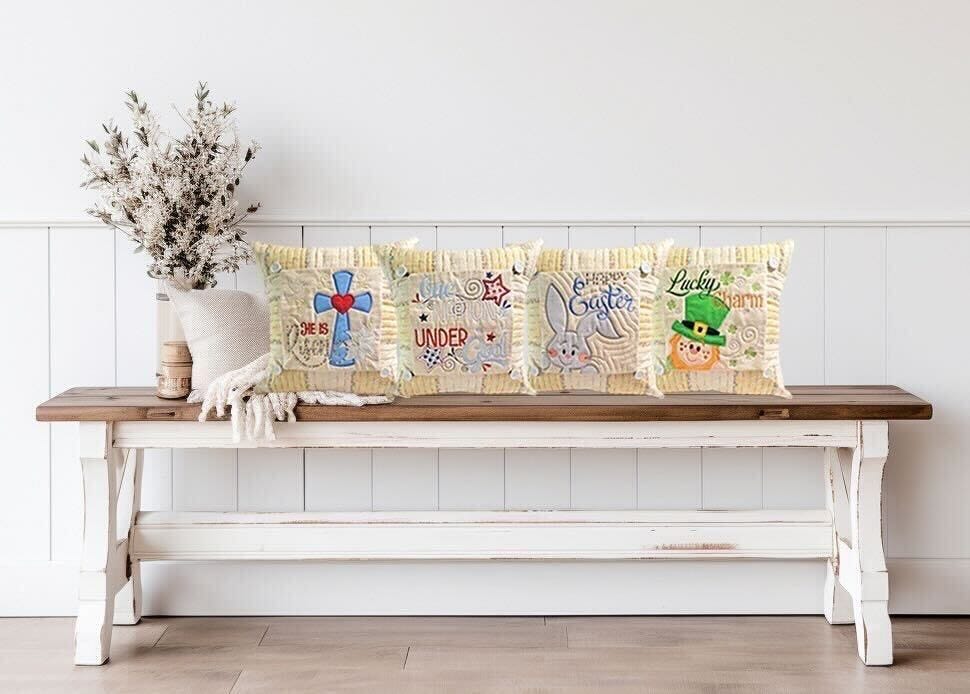 Create a pillow that can change for each holiday! Stitch one pillow cover then attach a button-on block for St. Patrick's Day, Easter or the Fourth of July!