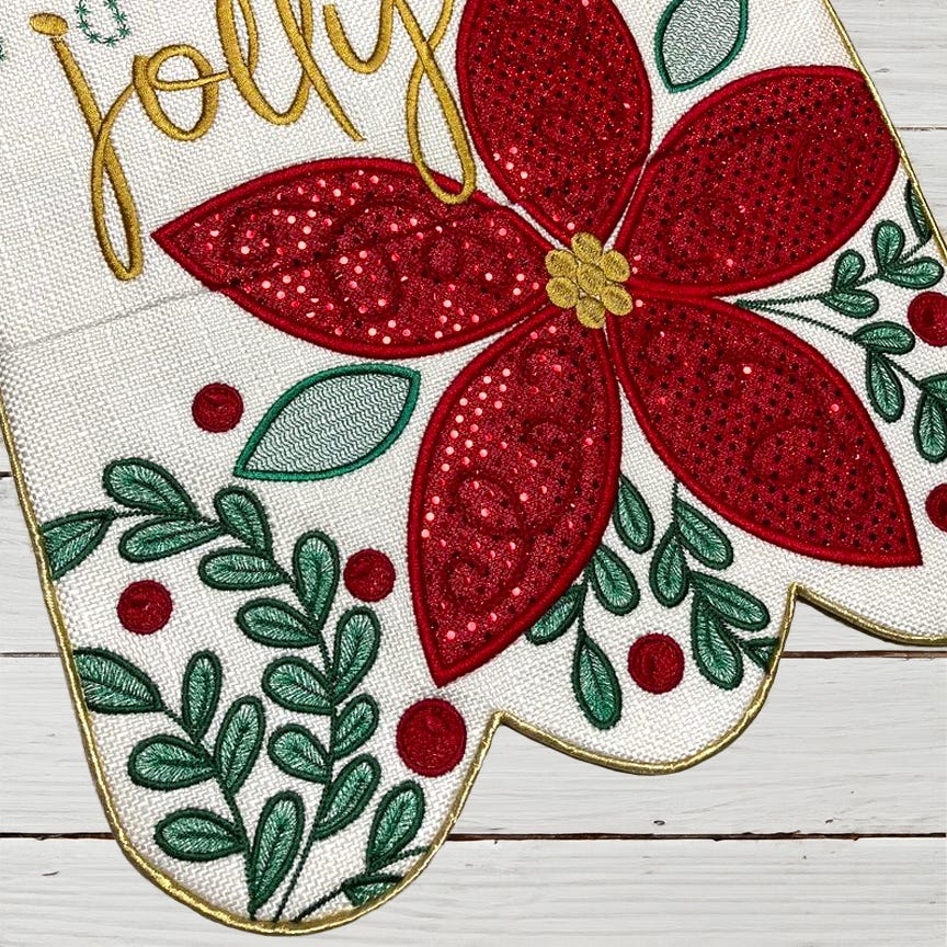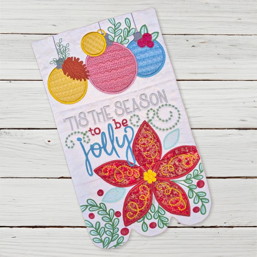 Spread Christmas cheer with our 'Tis the Season to Be Jolly Wall Hanging! It feature applique ornaments and poinsettia with satin stitch letting and embroidered design details.
