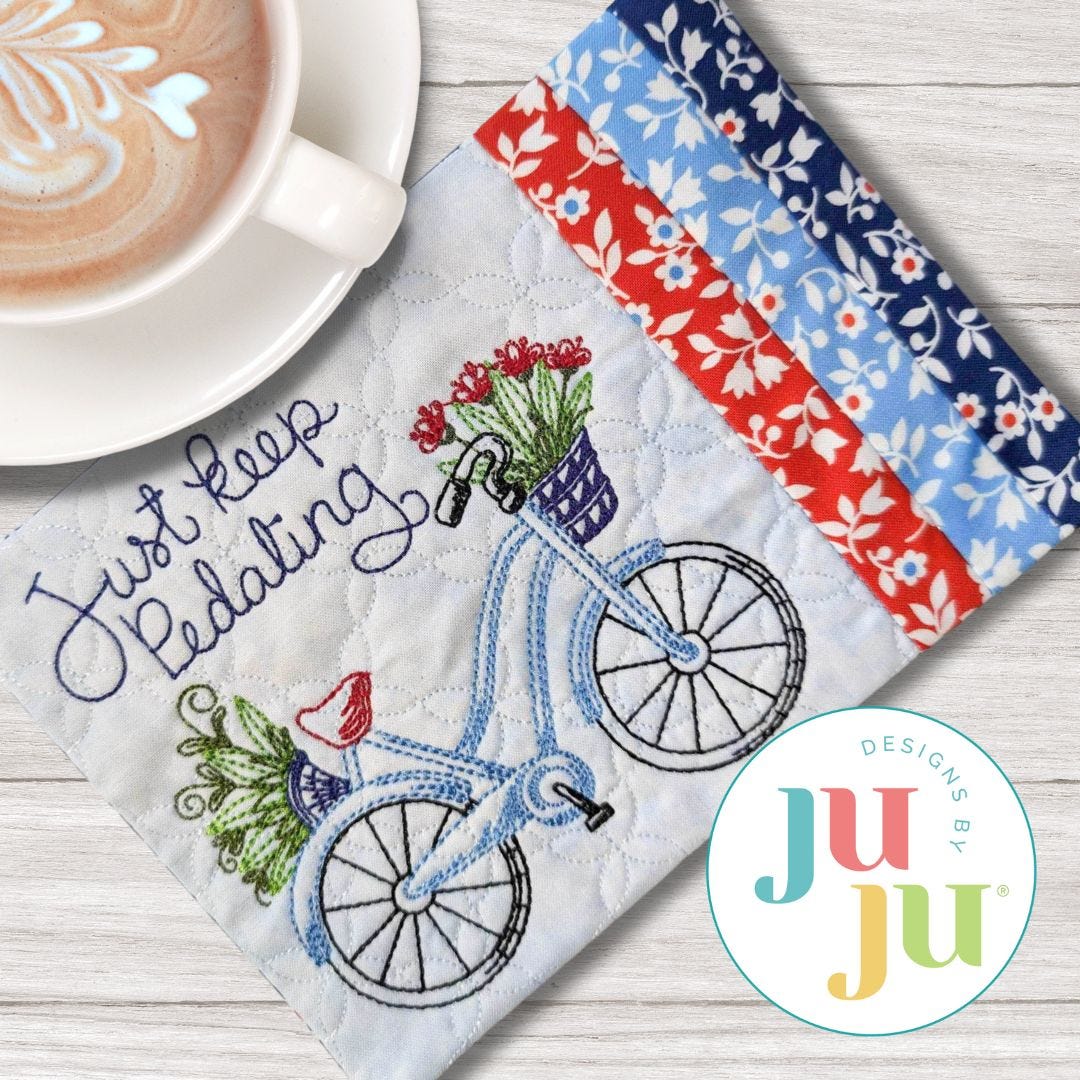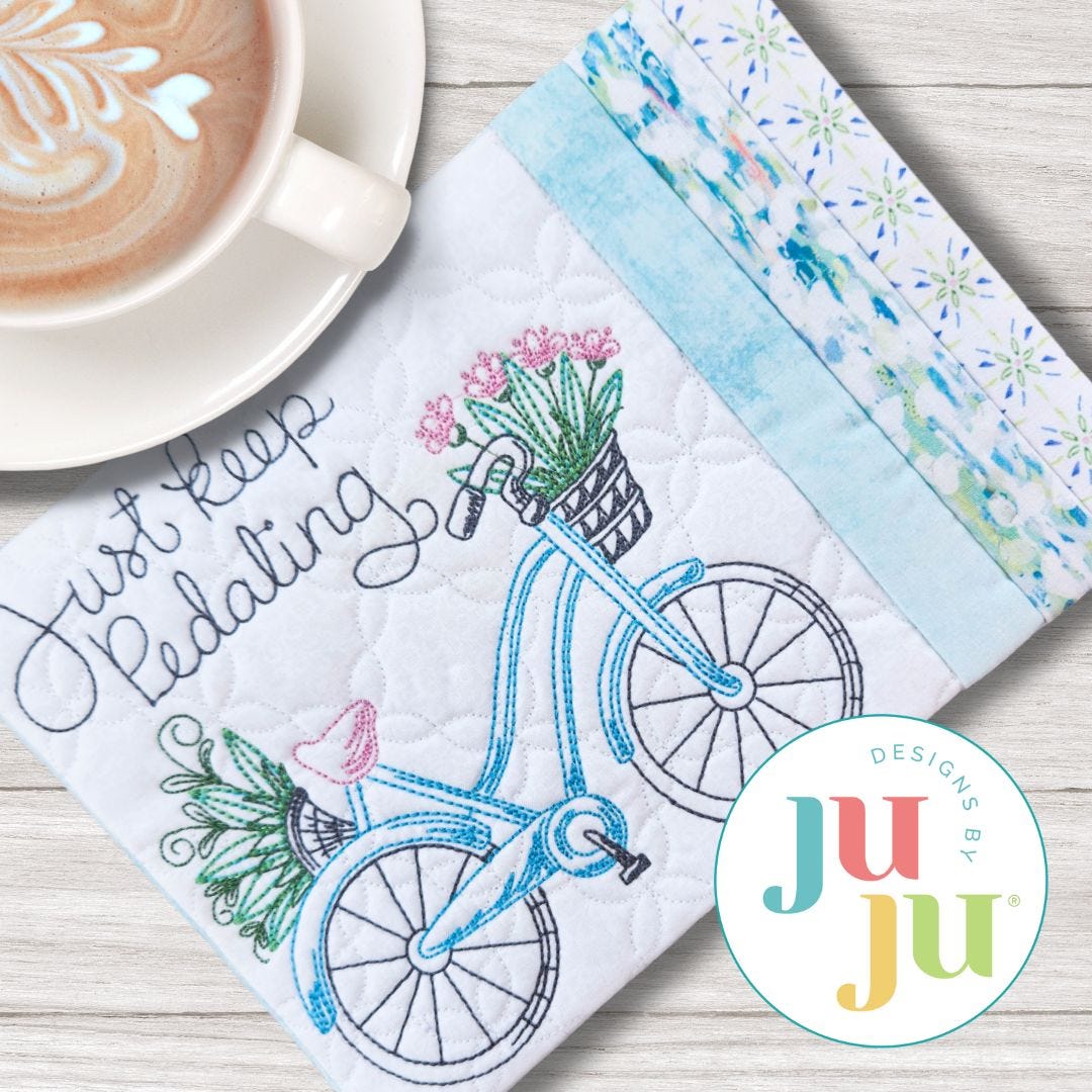 Just Keep Pedaling! This encouraging Mug Rug features bean stitch lettering and details for a sweet vintage look.