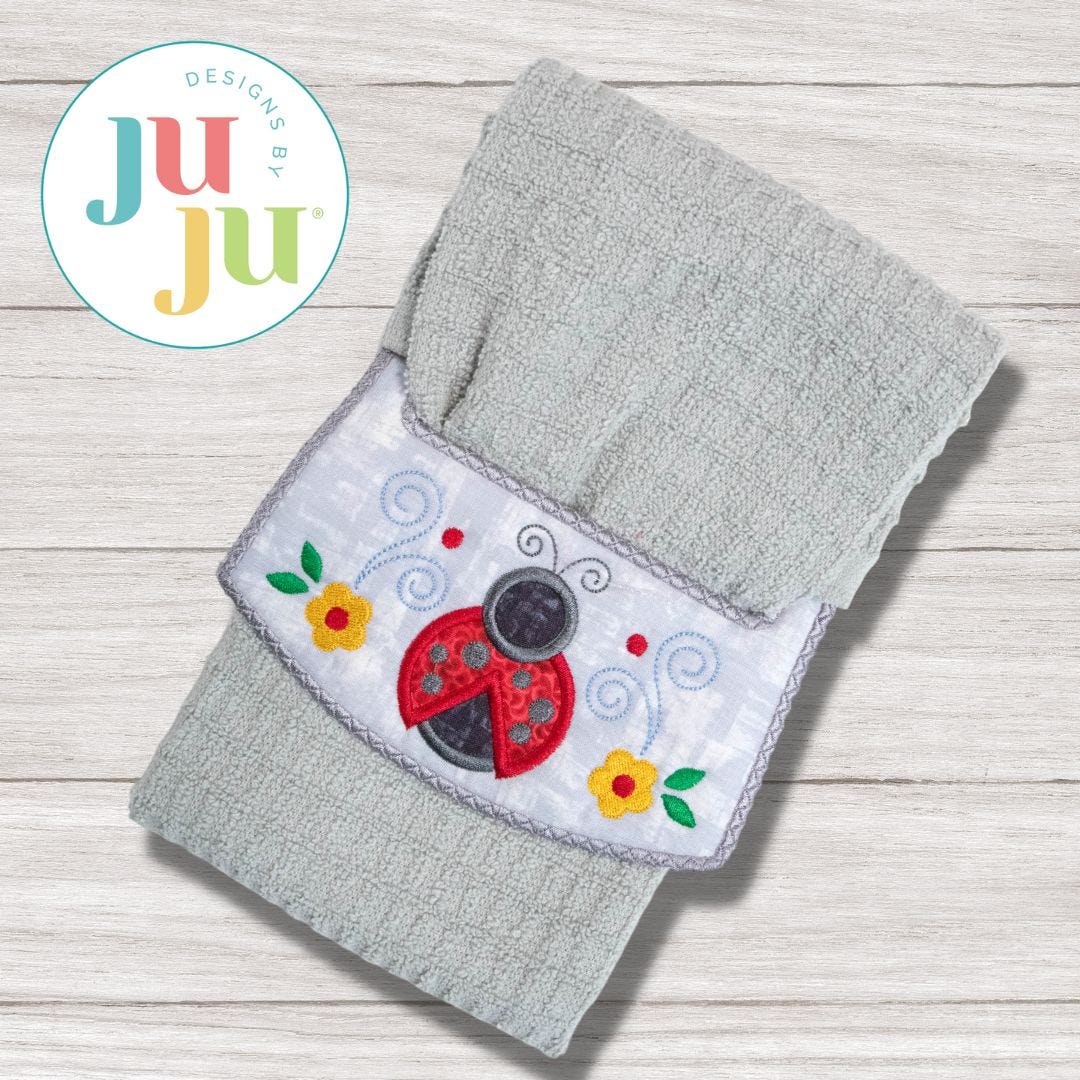 Bring summertime into your kitchen with our ITH Whimsical Ladybug Wrap Around Towel Topper! Customize the towel topper with fun colors, or coordinate with other ITH home decor projects! This topper features an applique ladybug with embroidered flowers.