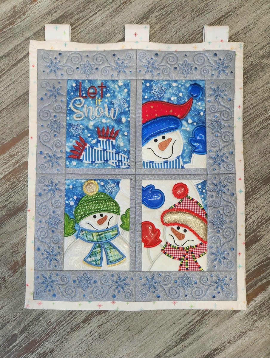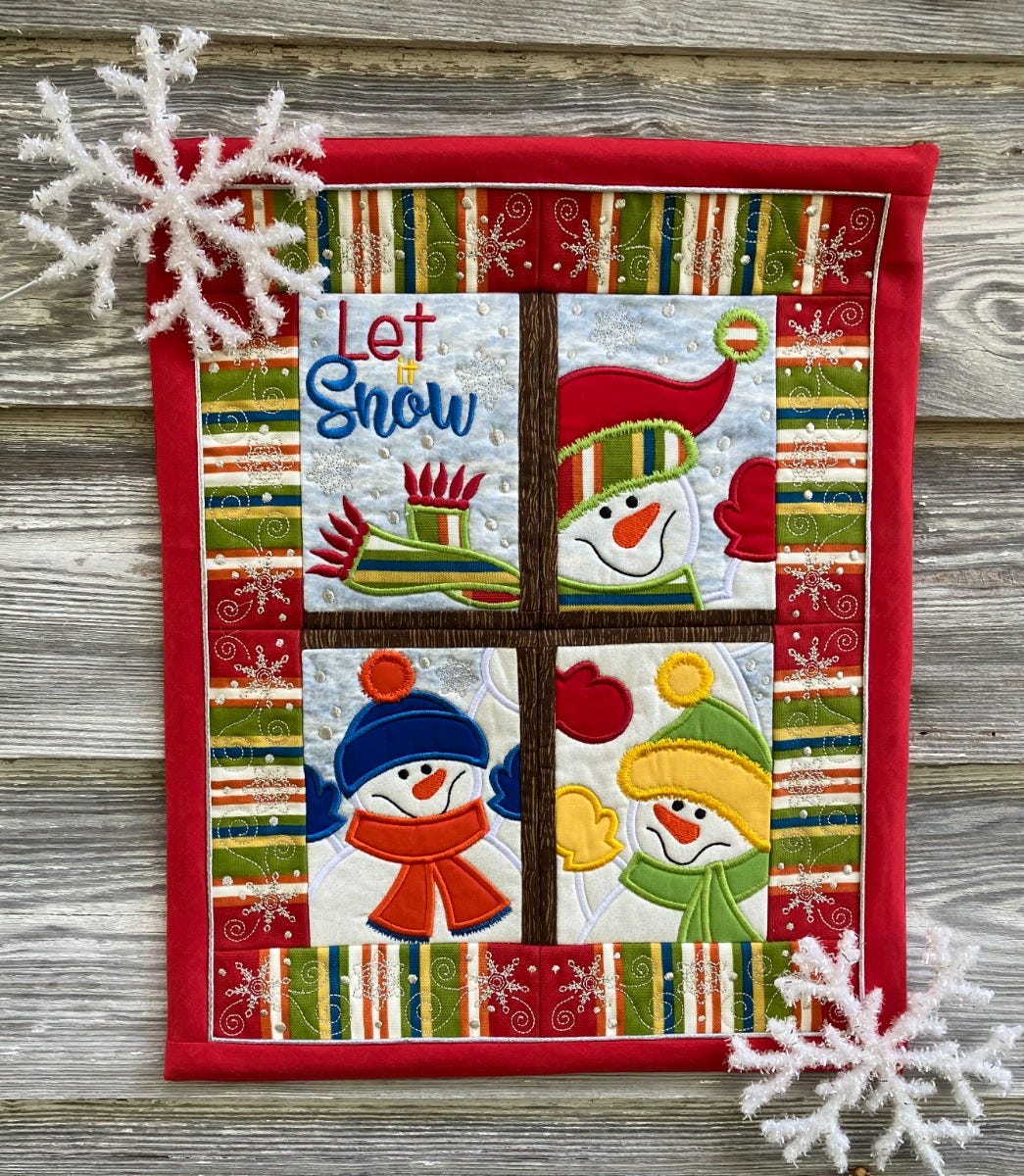 Stay warm inside and let it snow outside with this wall hanging of Snowmen waving to you through the window!