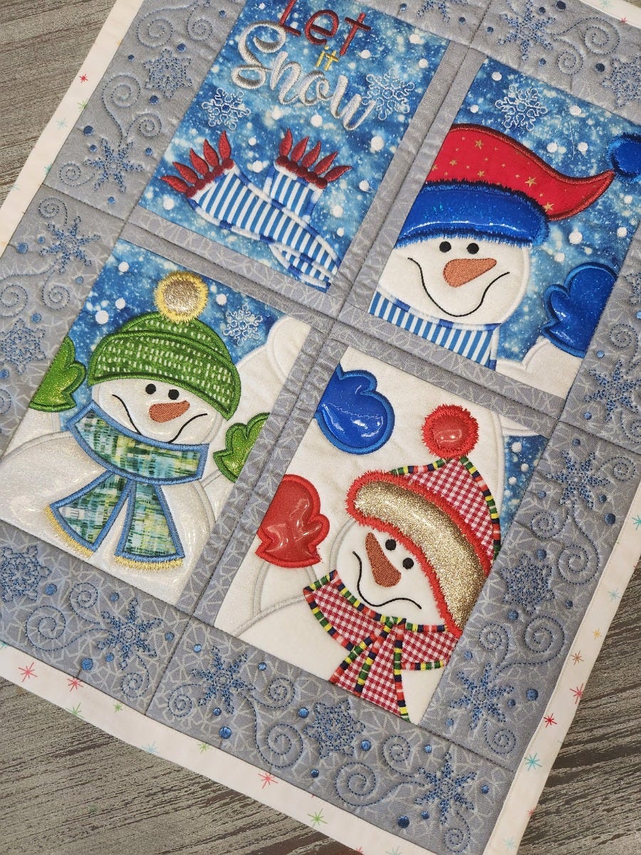 Requires 8 hoopings. Four main blocks and 8 border blocks are stitched completely in the hoop, then joined together with your sewing machine. The backing and tabs are added with your sewing machine.