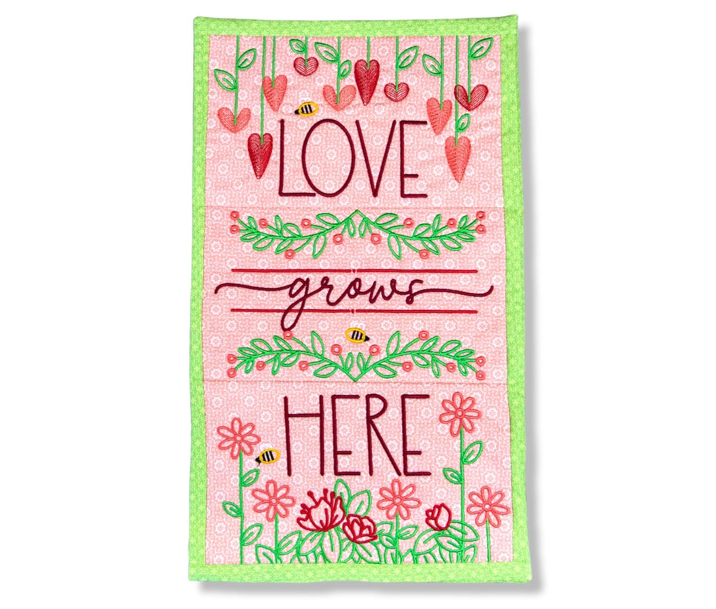 Celebrate the growing love of family with our Love Grows Here Wall Hanging! This wall hanging features sketch hearts and satin stitch lettering and flowers.