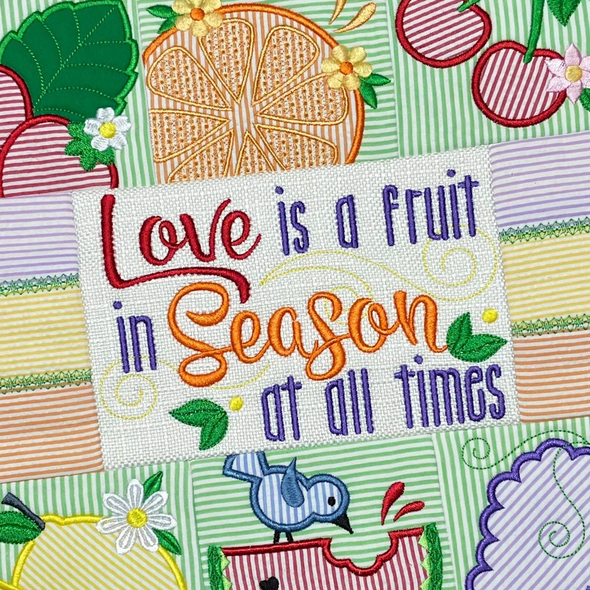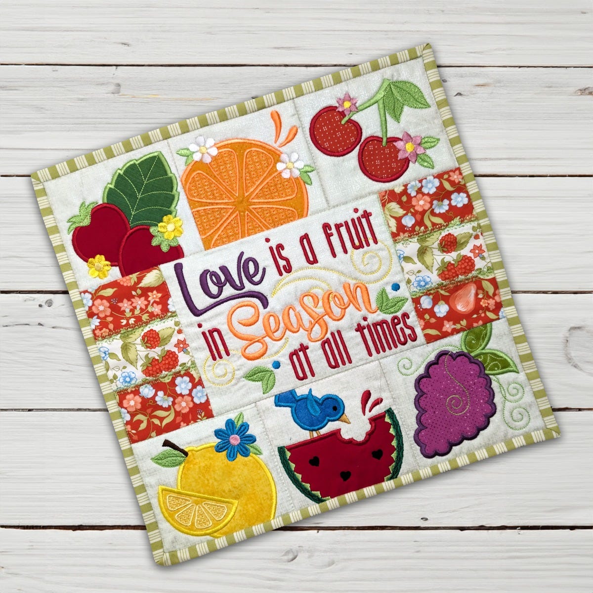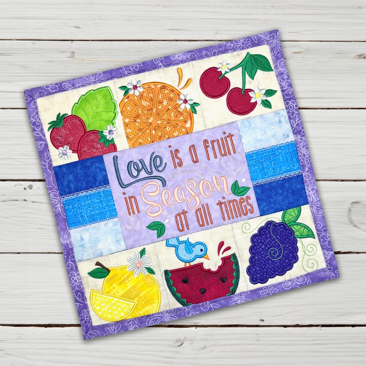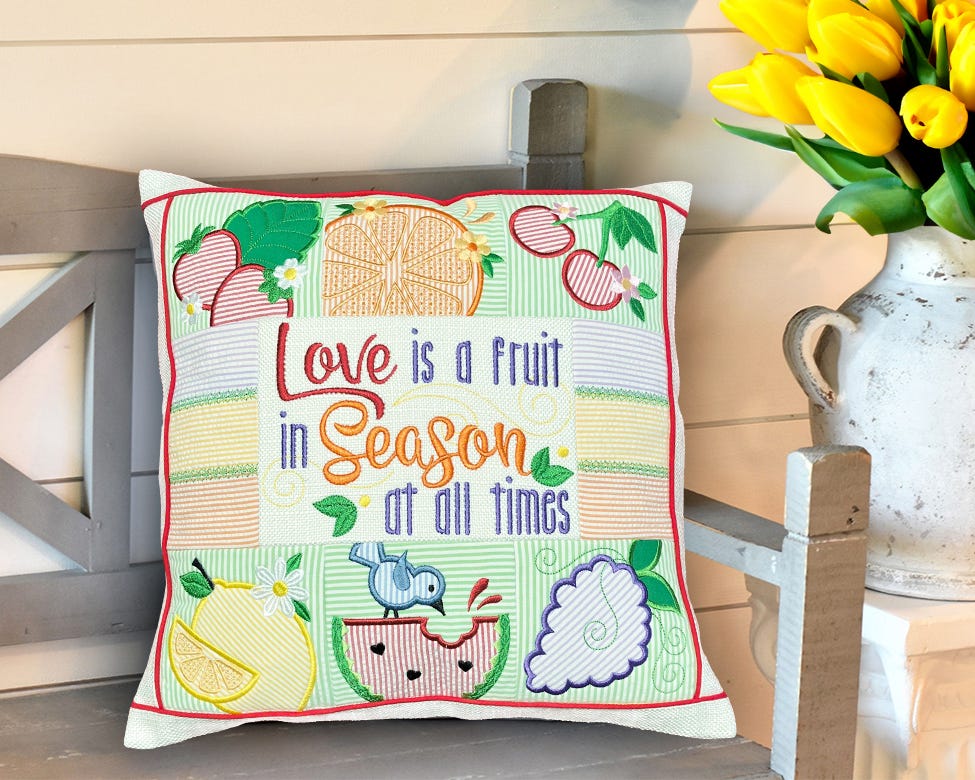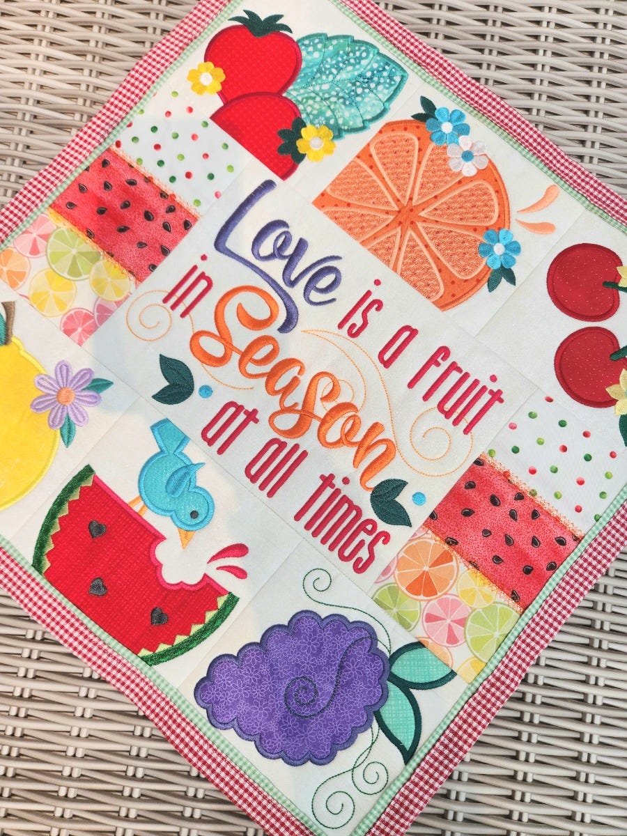Make a sweet petite quilt to declare that love is a fruit in season at all times! This project features applique designs of