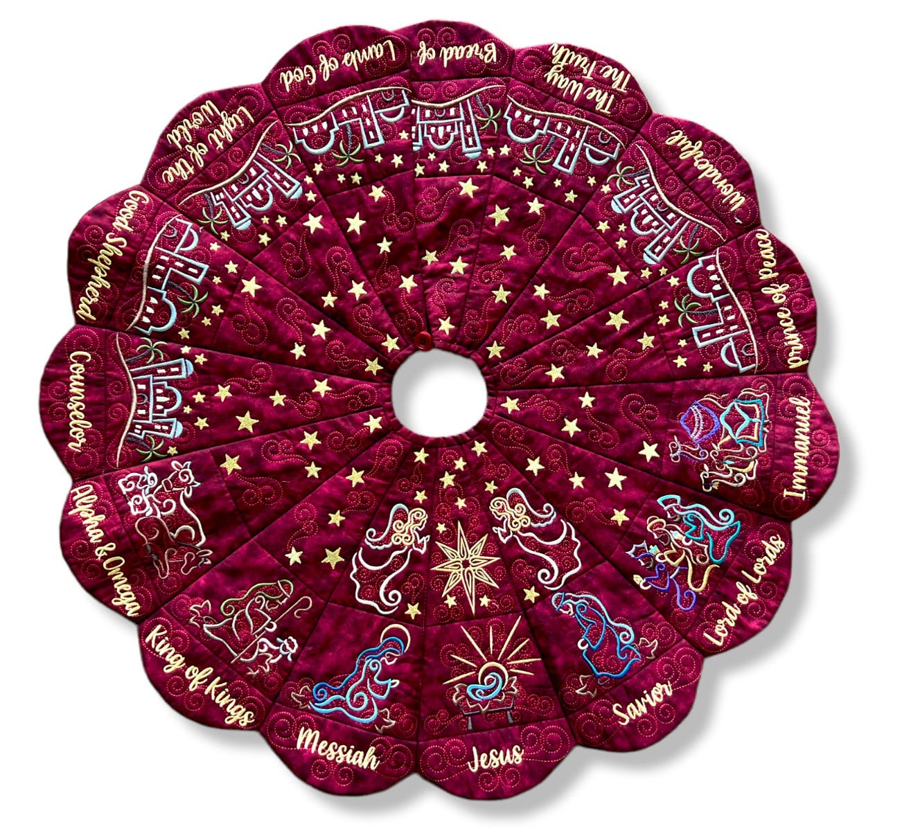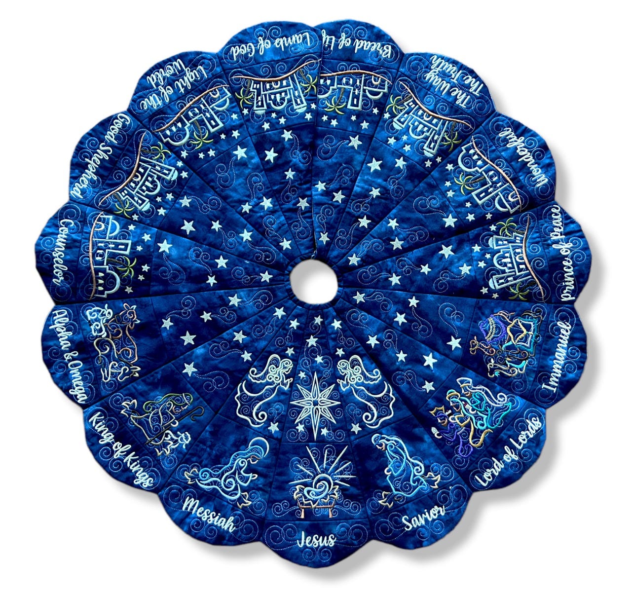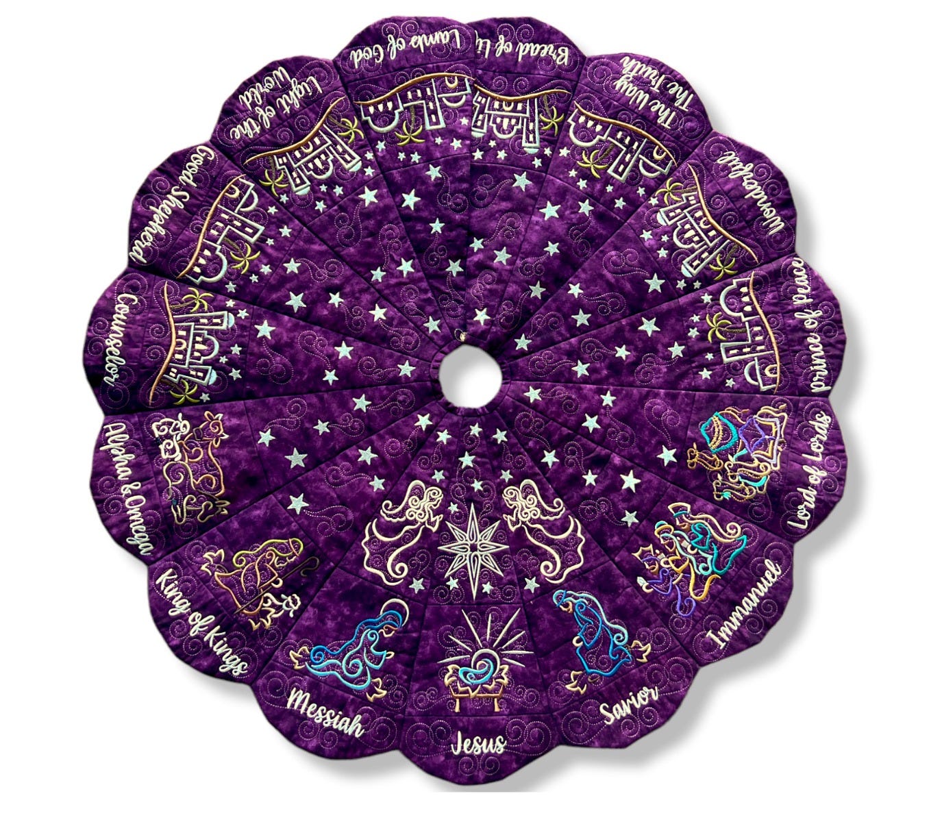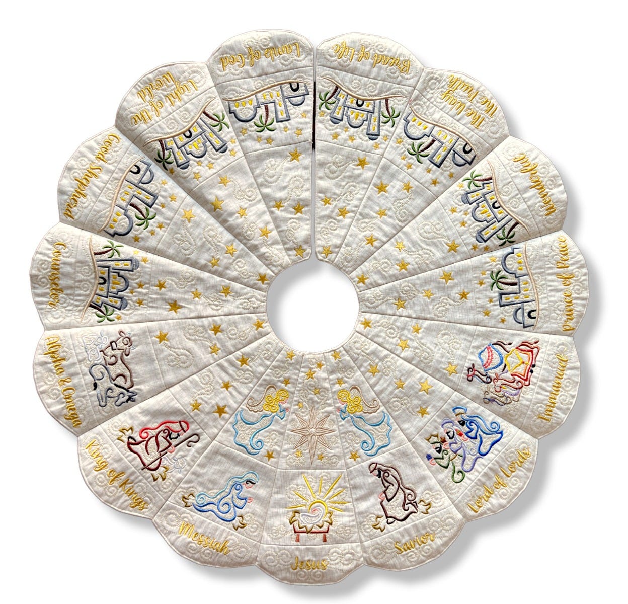 Note regarding the Outer Blocks: Only fifteen blocks are needed for the outer layer of the tree skirt, however nineteen blocks are included with purchase. Three words have alternate spelling options (Savior/Saviour, Immanuel/Emmanuel, Counselor/Counsellor) so be sure to select your preferred spelling when stitching out the blocks. Another block named Blank is included -- it has swirls but no text for those who wish to leave the outer blocks blank or wish to customize the block differently. Font Used: What a Time.
